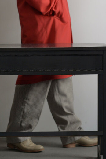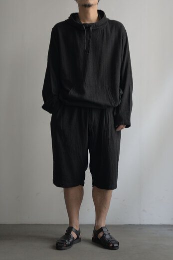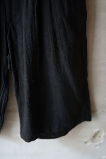 帰ってから服を脱ぎ(仕事の際に着る服)寝るまでの間(パジャマに着替える前)に着る服を探しているとお客様からお伺いした。それを聞き色々と考えてみた。その格好で宅配を受ける事も出来て家事もできる。近所のちょっとした買い物や散歩もできる。心地よさは絶対で、リラックスも出来るけどだらしなくは見えたくは無い。それで、都会にも行けるぐらいの面(ツラ)は欲しい。で、必ず自分のテンションは落としたくは無い。そういう意味で程よいバランスが取れる脱力感のあるこのショーツはシルクネップビエラという素材で定番のシルクネップと比べるととても柔らかい。バシっと決めるときも必要だけど、時々ピーンと貼った糸を緩める事も大切なんだと洋服から学ぶ。