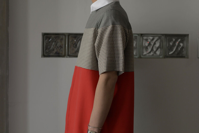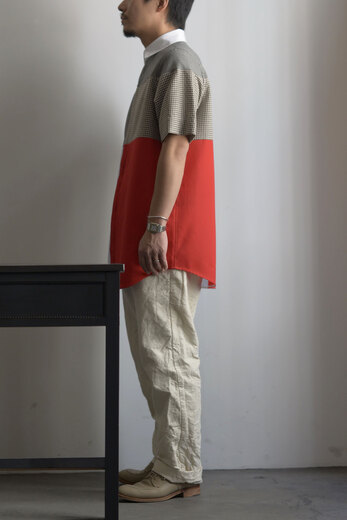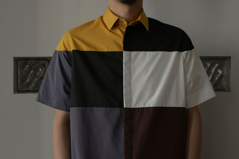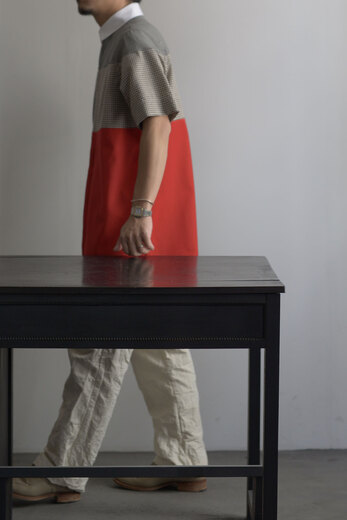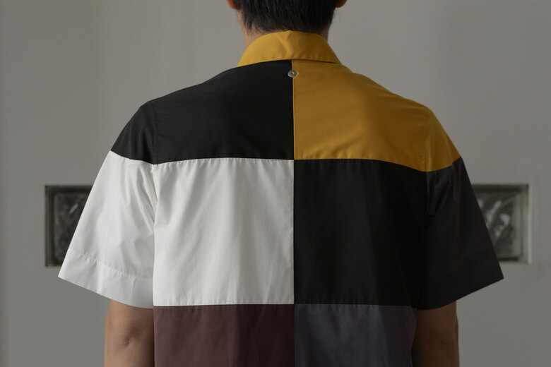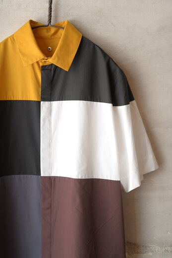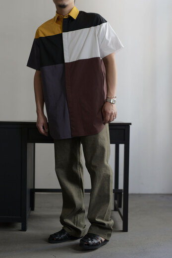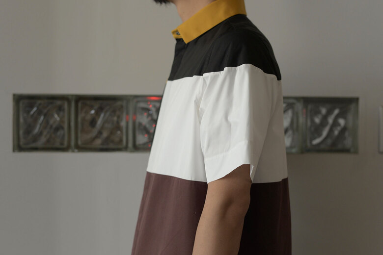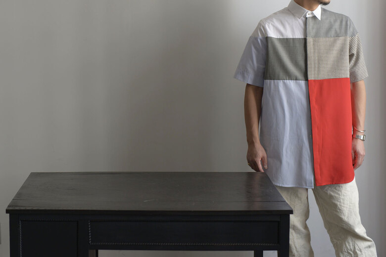 春が嫌いだ。なんとも生ぬるい感じでボーッとする。冬眠生活からまだ起き上がれないのに、テンションが高い。とはいえ、春の色は綺麗だし気候は穏やかで過ごし易い。パキッとした色目も格好良く眩しい。そうやって徐々に目を慣らし身体を慣し、起き上がっていきたい。窓から見える新緑の景色は、自分はその空間に居るにも関わらずその部分だけが浮かび上がり空気が変わっていて主張している存在になる。四季という広大さに気持ちが晴れる。やっぱり四季があるのは良い。と身勝手に思う。最近大阪を歩いていると黒い。せっかく春なのに…..と勝手な事を思う。色が組み合わさってバサっと切ったように見え、それは一枚の布として存在していて、前、後、右横、左横。(撮影した後に気づいたんだけど、上からも)どの瞬間を見ても違う。ふんだんに色が使われているのにミニマムだ。世の中には色が溢れている。色を組み立てる作業のようで、きっとこのシャツを着る時は朝から楽しいだろうな。