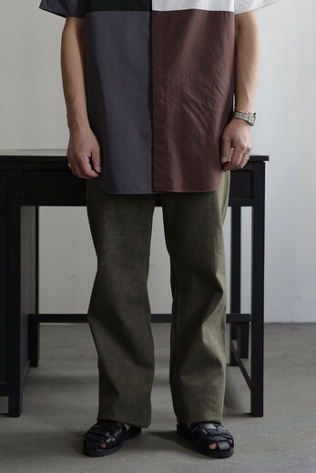 昔のイギリス軍のジャケットに使われていたグリーンデニムを思わせる。そんな『色』に惹かれたTOFU JEANS。ジンバブエコットンでゆっくりと織られた13ozの通年穿く事のできるデニムだ。ベルトループは無しで内側のストラップでウエストの調整が出来る。ポケットはバックのみ。初めは戸惑いそうだけど、そのうち慣れるでしょう。サイドシームが無くストンと落ちるラインがすごく自然。太過ぎず細過ぎず、腰回りがスッキリとしているので、シルエットが素晴らしい。いつもより足が長く見える様な気がする。そしてデニム特有のゴワッとした感じもなく柔らかい。穿き続ける事により少しずつフェードしていく過程はいつものデニムとは違うはずなので、そこも楽しみたい。