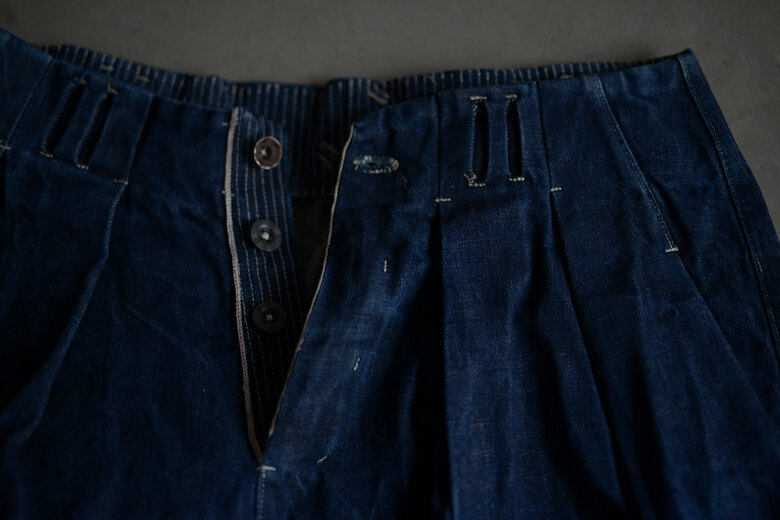 今回のデニムは面白い。ストーンウォッシュを施し、クラッシュしていたら手縫いで直す。クラッシュしていない場合もある。そして玉ねぎの皮を使って手染めする。そうする事によって酸化したようなヴィンテージデニムのような雰囲気になる。それはまるで一点物のように感じた。期間中はこの加工とワンウォッシュお好きな方を選べます。ぜひご覧ください。