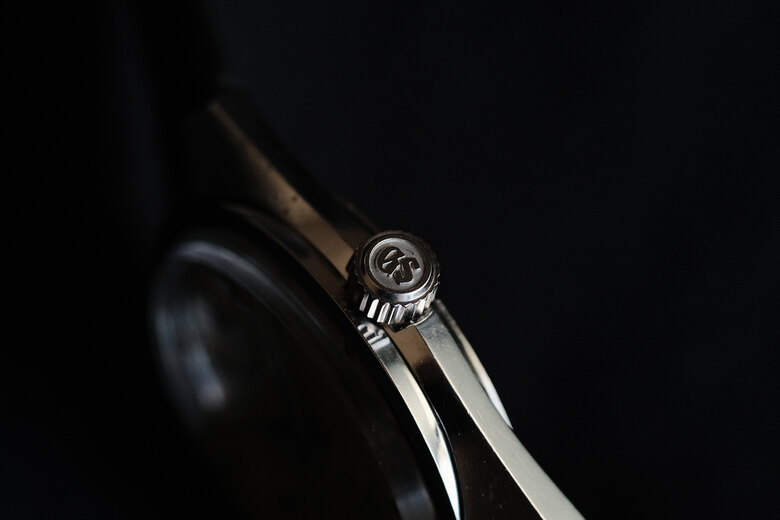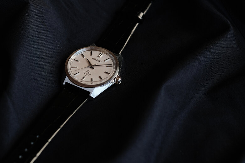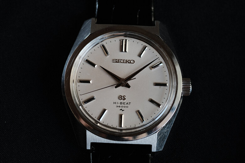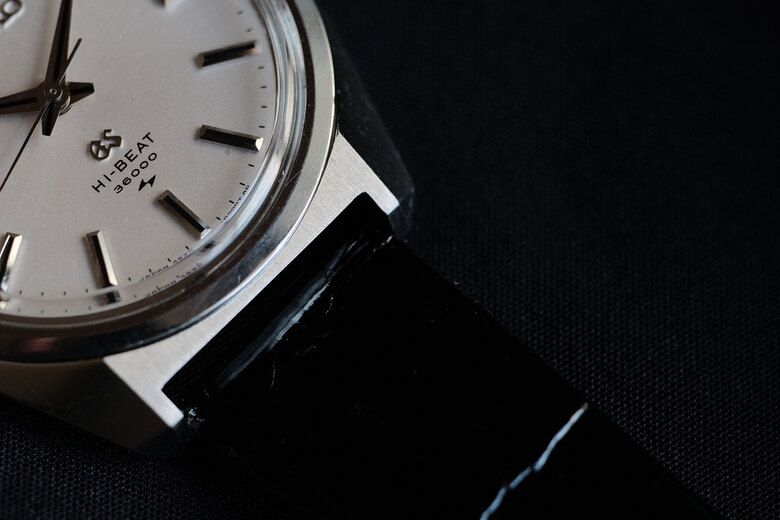 1960年(昭和35年)に諏訪精工舎から発表された国産腕時計の最高峰モデルであるグランドセイコー。こちらは通称45GSと呼ばれる手巻きのハイビートモデル、1968年10月に製造された個体です。グランドセイコーは「スイス製腕時計にも負けない精度の国産腕時計を生み出す」という命題のもと徹底的に精度を追及し、スイス・クロノメーター規格に準拠した独自の社内検定制度を設けるほどでした。初代グランドセイコーが発表された後もムーブメントの改良を重ねていき、この45GSは当時のトレンドでもあった高振動(ハイビート)ムーブメントを搭載したモデルです。10振動という高振動化により等時性に優れ、姿勢差、外乱の影響などに対してもより安定した高精度を実現しています。もうひとつ特筆すべきなのが44GSによって確立されたセイコー独自のデザイン理念である「セイコースタイル」を採用した外装デザインです。日本特有の美意識について見つめ直し、和の様式である「屏風」や「障子」などが歪みや捻じれのない平面で構成されていることからインスピレーションを受けて生み出されたデザインは、ケース、ダイアル、針全てにわたって平面を積極的に取り入れ、面と面のつなぎ目のエッジをしっかりと際立たせることでシャープな印象をつくりだしています。また「ザラツ研磨」という特殊な研磨方法を取り入れることにより極めて歪み少ない平面が実現し、見る角度により時計全体に美しい光と影の陰影が生まれます。