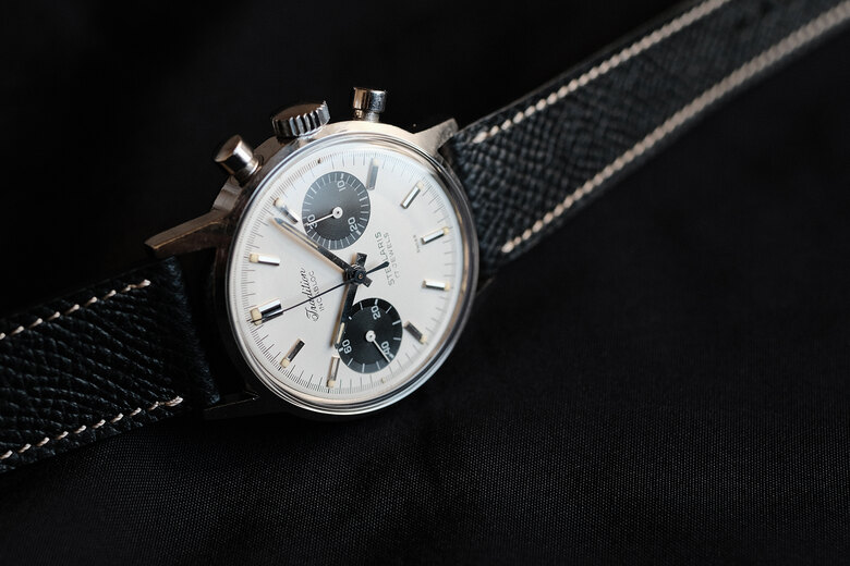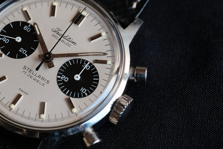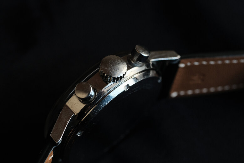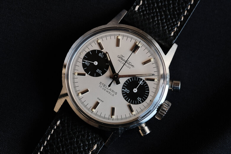1960年代のシアーズのプライベートブランド(以下PB)であるTraditionの2レジスタークロノグラフ。ホワイトダイアルにブラックのインダイアルを備えた通称”パンダダイアル”と呼ばれるデザインの1本です。特に目立つ装飾こそありませんが堅牢なスクリューバック仕様でエッジの効いた無骨なケースラインはシンプルながら力強さも感じさせます。搭載するValjoux7730は傑作クロノグラフムーブメントを数多く生み出したVenus社のCal.188の流れを汲むムーブメントで、近代的なカム式クロノグラフの先駆けともいえるムーブメントです。近年は日本でも小売店や卸業者が企画・開発し販売するPBはとても身近なものになりましたが、小売業が早くから発展していた欧米ではより歴史も長く、古くは1844年にイギリスのロッチデールで設立された「ロッチデール公正開拓者組合」まで遡り、質の良い生活必需品を適切な価格で提供するという目的で独自に仕入れた商品に固有の名称を付けて販売していたのが始まりだという。シアーズも1900年代初めにはPBを導入しておりUSのヴィンテージウェアが好きな方は「Hercules」や「Pilgrim」といったシアーズのPBを目にしたことがあるかもしれません。このTraditionもシアーズのPBのひとつで時計や衣類、カトラリーといったアイテムを展開していたようです。ダイアル下部にある「STELLARIS」というのもPBのひとつのようでこちらは腕時計を中心に展開しており、中にはSeikoが製造した手巻きや電磁テンプムーブメントのモデルも存在しているのですが、PBごとの商品ラインナップがどのようにカテゴライズされていたのかははっきりとはわからず、このTraditionクロノグラフもどうしてSTELLARISとのダブルネームとなっているのかは不明です。ブランドがどうであれ非常に完成されたデザインで美しい時計ではありますが、より魅力を引き立てるエピソードとしてこのモデルはクロノグラフをはじめとするスポーツウォッチの名門として知られるHeuer(現Tag Heuer)によって製造されたのではないかと言われていることがあります。シアーズがPBとして販売していた時計は様々なメーカーによって委託製造され、その委託先は先述のSeiko以外にもSicura(Breitlingの前身)やHeuerなどがあったとされています。特にHeuerとの関係は強く「ALLSTATE」という自動車関連用品を扱うPBではHeuer製とされるダッシュボードタイマーがあったり、70年代に入り時計市場を席捲していたクオーツ時計に対抗すべくより安価で若い世代へとアピールできるモデルとして開発されたEasy RiderというクロノグラフがSears銘で販売されたりもしていました。こういった経緯もこのモデルがHeuerによって製造されたと言われる理由のひとつですが、さらに6時側ケースサイドに刻印されている『7723』という番号を調べてみると同じ7723というリファレンスナンバーでケースやダイアルなどのデザインや搭載するムーブメントも全く同じモデルがHeuerに存在するのです。こういったHeuerブランドの時計と全く同じデザインのモデルがZodiacやDugena、Clebarなどのメーカーに存在することが知られており、特に欧米ではヴィンテージウォッチのひとつのジャンルとして熱心なコレクターがいるほどの人気があります。明確な資料が無いためあくまで「このような一説がある」と言うに留めますが、かつて一時代を築いた今は無きアメリカの老舗百貨店にこのような時計が並んでいたのだという興味深い歴史性は間違いなくこの時計の大きな魅力でしょう。