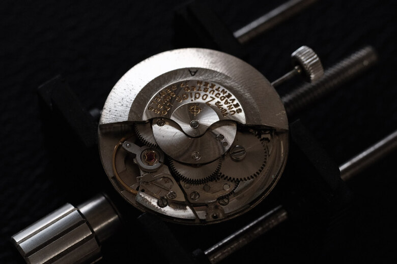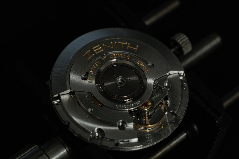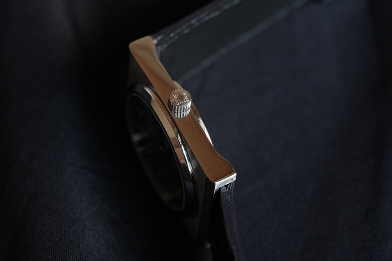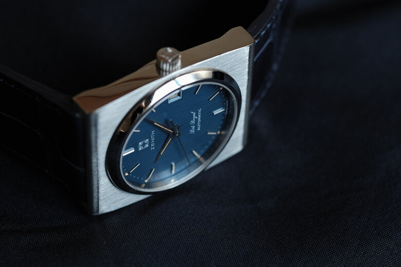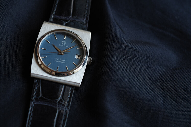 近年はレクタンギュラーモデルを中心に人気を博したゼニスのポートロワイヤル。ゼニスのアイコンとも言えるエルプリメロを前面に打ち出したクロノマスターや、シンプルかつエレガンスも感じさせる洗練されたドレスラインであるエリートなどと比べると少々影の薄い存在であったこのシリーズは2010年代半ば以降残念ながら実質休止状態となっていますが、その歴史は長く始まりは1950年代まで遡ります。そのファーストモデルはヌーシャテル天文台コンクールにて1950年~1954年の5年連続1位に輝いた実績を持つ同社の手巻きムーブメントの最高峰であるCal.135を搭載した特別なモデルでした。今回ご紹介するのは多彩なモデルがラインナップされていたポートロワイヤルシリーズ最盛期といえる70年代に製造された1本。僅かにカーブを描くシンプルなトノーケースにラウンドダイアルの組み合わせが70年代らしいデザインです。同モデルはダイアルカラーがブラック・ホワイト・ブルーの3色ありこちらは中でも希少なブルーダイアルの個体で、ややグレーがかった上品なブルーは過度に主張し過ぎることなく静かに腕元を彩ってくれます。搭載するCal.49.0は信頼性の高いETA社のムーブメントをベースにしており、構造上厚みが出やすい自動巻きながら比較的薄型の設計となっているおかげで時計全体の厚みもおよそ8.5mmに抑えられています。ハック機能と日付の早送り機能も備えているので実用性の点も十分でしょう。