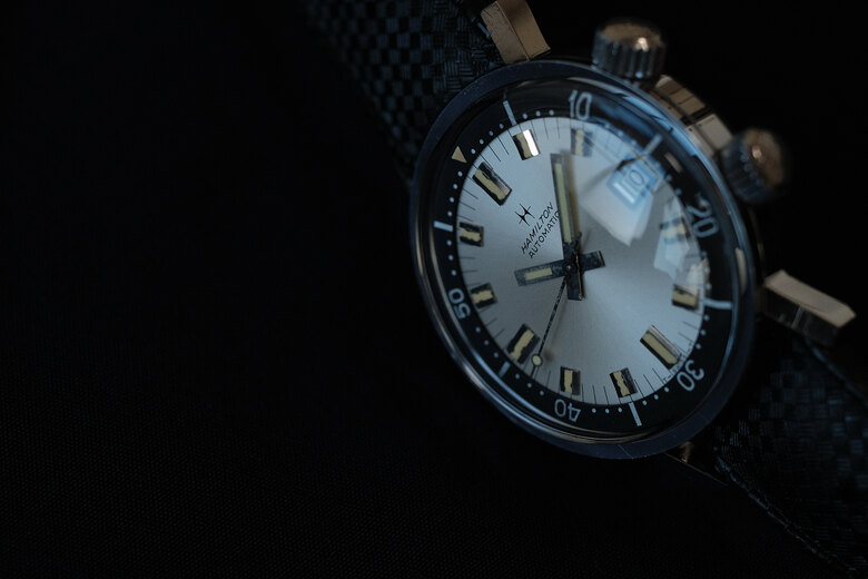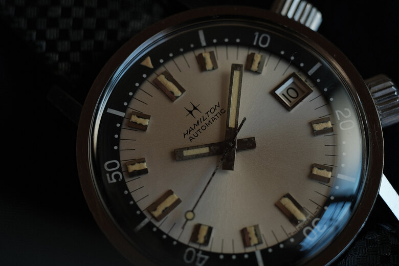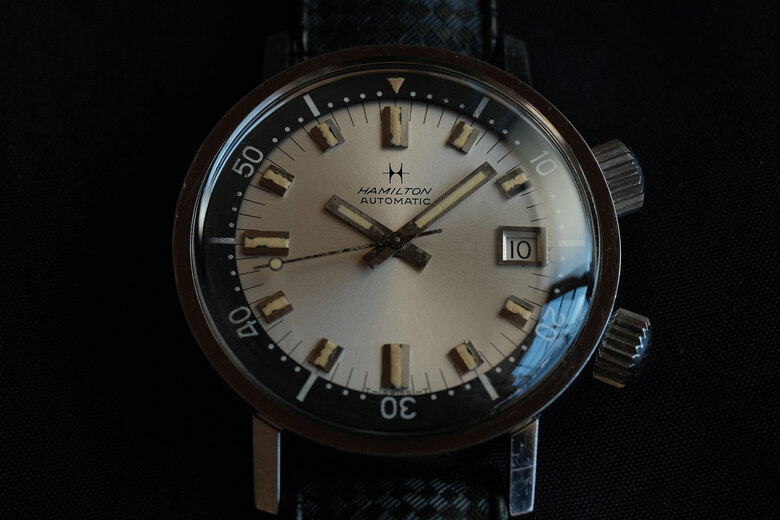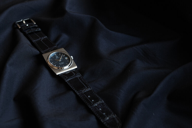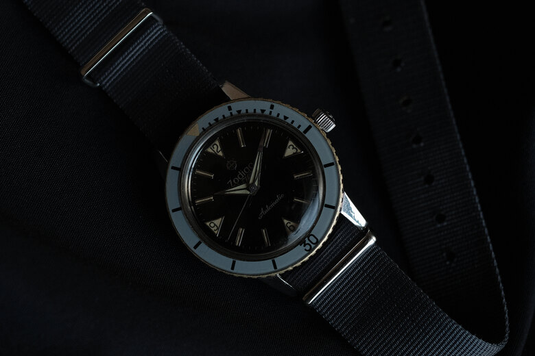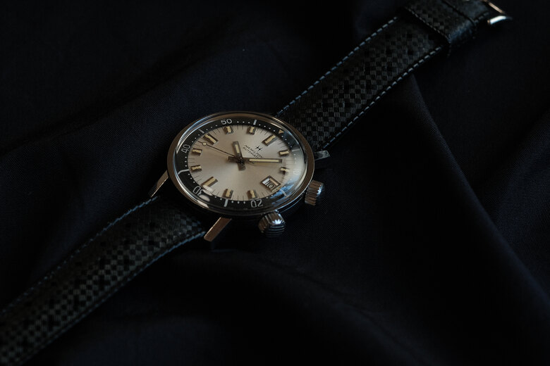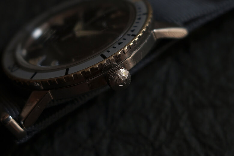 回転式インナーベゼルを備えたダイバーズモデルAqua-Date 600。スイスのケースメーカーであるERVIN PIQUEREZ S.A.(EPSA)によって製造された特徴的な2つのリューズを持つスーパーコンプレッサーケースは、ケースにかかる水圧が上がると各部のガスケットが圧縮されて密閉度が増すことにより高い防水性能が確保されるという画期的な構造を持っており60年代から70年代にかけてジャガールクルトやロンジン、IWCなど数多くのメーカーに採用されました。2時位置のリューズでインナーベゼルの調整、4時位置のリューズでゼンマイの巻き上げや時刻調整ができます。このEPSAのデュアルクラウンケースは約42mmのラージタイプと約36mmのスモールタイプがありますがこちらは小振りなスモールタイプ。現行のダイバーズモデルではなかなか見られないクラシックなサイズ感で腕回りが細めの方にもおすすめです。ダイバーズウォッチはその特性上ダメージが目立つ個体が多いのですがこの個体は全体的に良好なコンディションを保っており、やや日に焼けてシャンパンカラーとなったダイアルや味わいのある夜光など魅力的な経年変化を楽しむことができます。ベルトは販売当時も採用されていたスイスのTROPIC社のヴィンテージラバーベルトを取り付けました。搭載するムーブメントは信頼性の高いETAキャリバーをベースとしたCal.64となります。