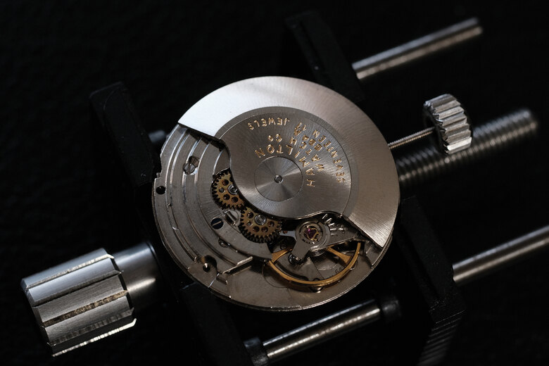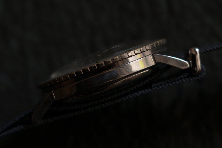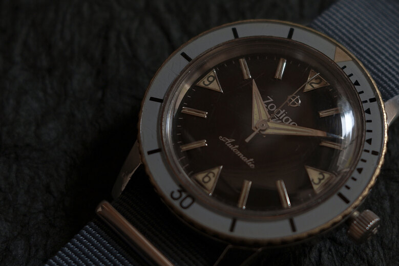ロレックス『サブマリーナ、ブランパン『フィフティ・ファゾムス』と同年の1953年にファーストモデルが発表されたシーウルフ。他の2モデルがダイバーズウォッチとしては一般的なねじ込みリューズやスクリューバックケースにより防水性を高めているのに対し、シーウルフはねじ込みではないノーマルリューズにスナップバックケースながら同等の20気圧防水を実現しました。ダイバーズウォッチ黎明期から現代までその系譜を連ねるゾディアックを代表する傑作モデルです。多種多様なバリエーションが存在していますがこちらは60年代後半に製造されたと思われるベークライトベゼルを備えた1本。特徴的な12・3・6・9の三角形の夜光インデックスや大型のドーフィン針は初期シーウルフから続くアイコン的なデザインです。ベークライトは割れたりヒビが入るなど痛みやすい素材ですがこの個体は全体的にコンディションも良好で大きな損傷はありません。落ち着いた光沢のあるブルーグレーのベゼルとブラックダイアルとのバランスも絶妙で他にはない個性的なデザインです。搭載するムーブメントはA.Schild社のムーブメントをベースに改良されたCal.70-72。自動巻き機構はDoxa、Eberhard、Favre-Leuba、Girard-Perregauxという錚々たるメーカーと共同で開発され、時刻調整時に秒針が停止するハック機能を備えるなど実用性も高いムーブメントです。