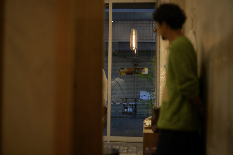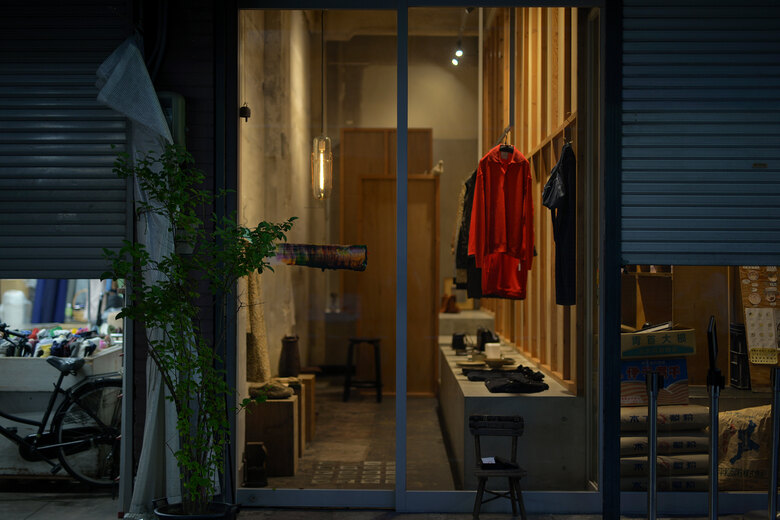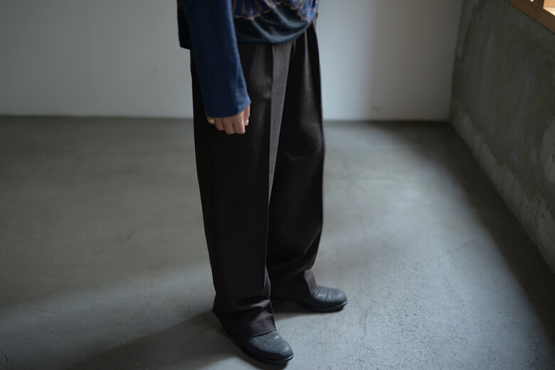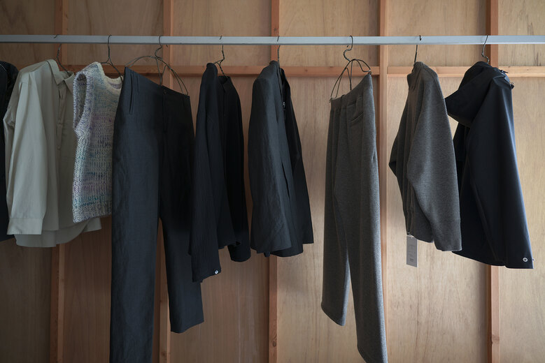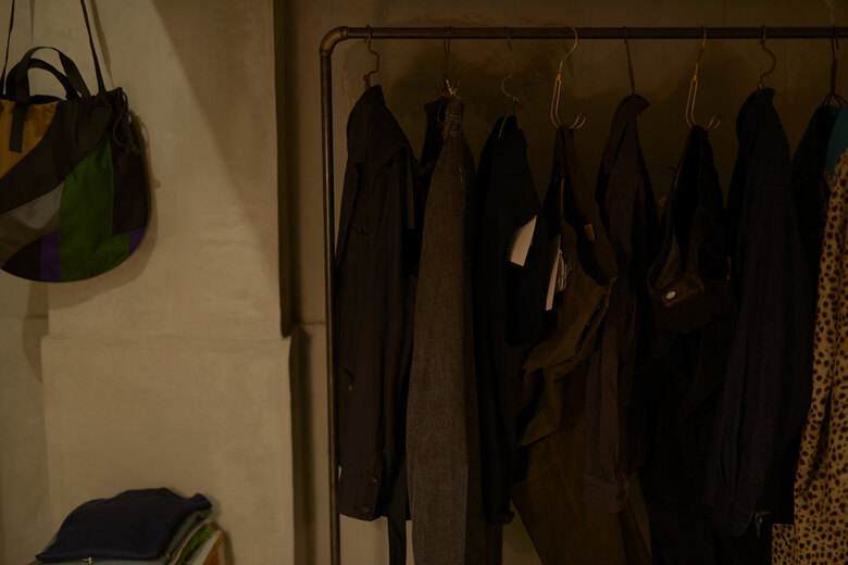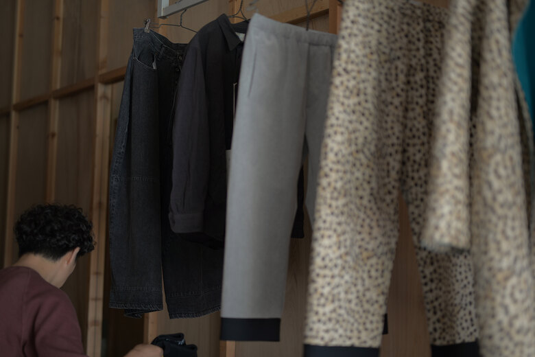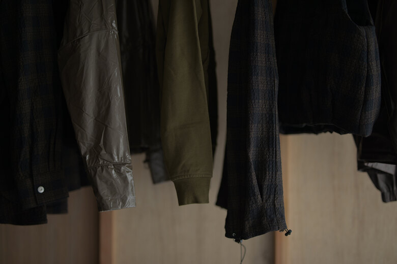 って事で、1階はOmar Afridi 23AW “PRIMITIVE TECH”を並べました。今回のコレクションのテーマは、”PRIMITIVE TECH”。違和感と有機的な感じが混ざりあっている事が心地が良い。例えば、ウールを使ったクラシックなチェックの生地にスナップボタンやレザーアノラックのZIPは止水ジップが使われている。ナイロン素材のフーディーを自然素材とスタイリングしたりと……ハンガーラックに並べられたそれらを眺めて、手に取り鏡の前であーだこーだと想像してみましょっ。