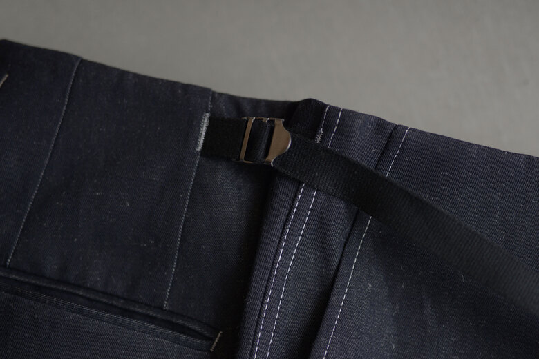 プルパンツは初期の頃から改良を積み重ねて作り続けている定番品で僕自身も様々なプルパンツを着用しています。1番の特徴は名前の通りサイドのアジャスターを引くだけで良いところ。サイドのアジャスターはミリタリーからの着想ですが、普通は紐を後ろに引きます。これが結構やり辛くて、結局普通のベルトを使っていました。アンはそれを逆に付けていて前に向かって引きます。その方が左右均等に力が入り、しっかりと素早く固定できたのです。初めて穿いた時は着脱が簡単すぎて感動しました。