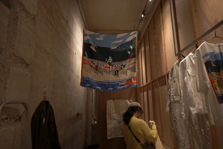 本日よりスタートです。今回もパリのアーティストSanae Nicolasさんの絵をプリントしたTシャツとシルクスカーフ、フランスやイタリアのヴィンテージのワークウェアに刺繍を施した一点物が並んでいます。靴下やキャップやハンカチも!定番のロウ引きコットンの洋服もございます。皆様のお越しをお待ちしております。