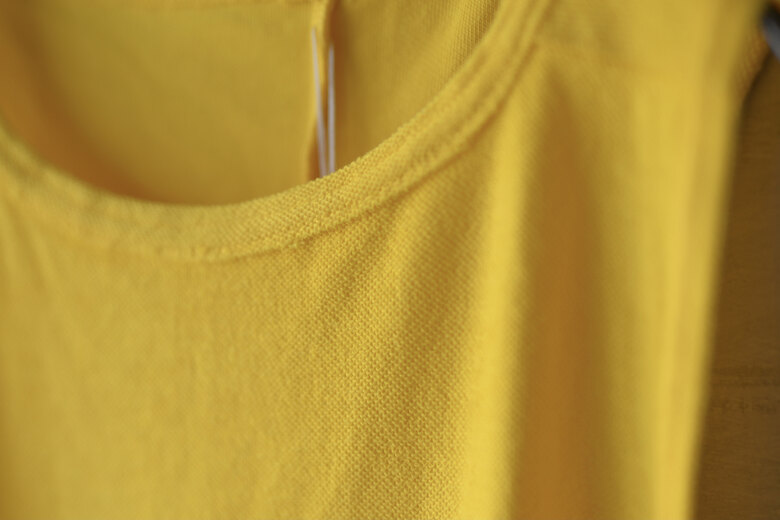 『ターメリックの染色、めちゃくちゃハッピーな色合いで良いですね。』とお客様。暑さも吹っ飛びそうな黄色はカレーを煮込むように時間をかけて何度も染めたそうです。染め物なので着用や洗濯を繰り返すとフェードしていきます。少しずつレモンイエローのような、それもまた良い色になるんだろうなと想像しています。差し色に使いたい。なんなら一枚でも着てみようかと思わせてくれました。明日からも皆様のお越しをデザイナーと一緒にお待ちしております。(土曜日は通訳の方もいます!)