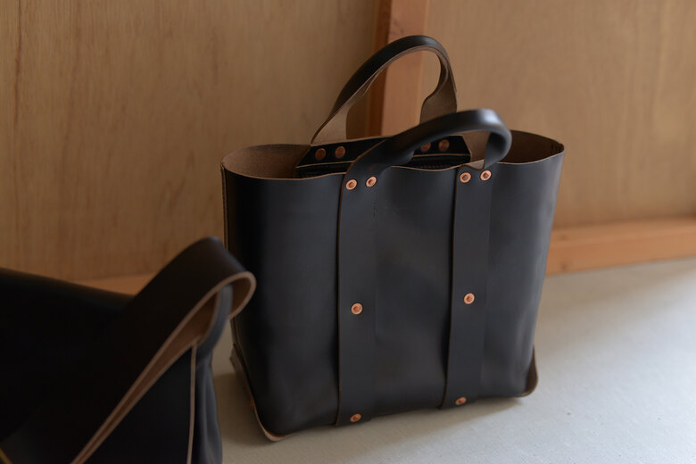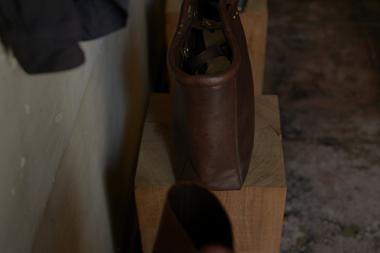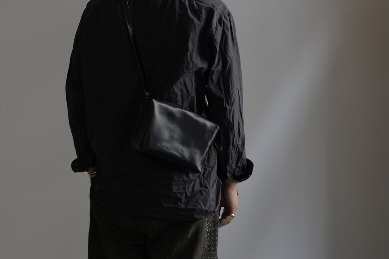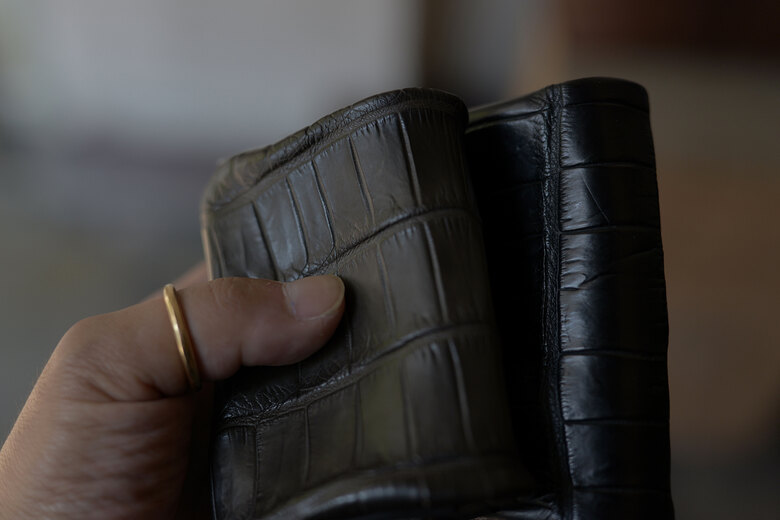 今回新しく使っている革はホーウィン社のクロムエクセル。クロムエクセルとはコンビ滑しという方法で滑し牛脂、蜜蝋、植物性脂と魚脂をブレンドしたオイルを染み込ませたレザーです。しっとりとしていて手に吸い付いてくるような、ずっと触っていたくなるような、そんな革。ベースはブラウンで上から黒の染料を入れています。使っていくとそのブラウンが少しずつ出てきます。無色のクリームを使っても良いし、黒のクリームを入れて黒をキープするのも、そして何もしないのも、使う人の好みで育てて欲しいと仰られていました。