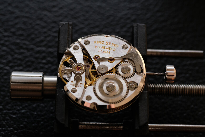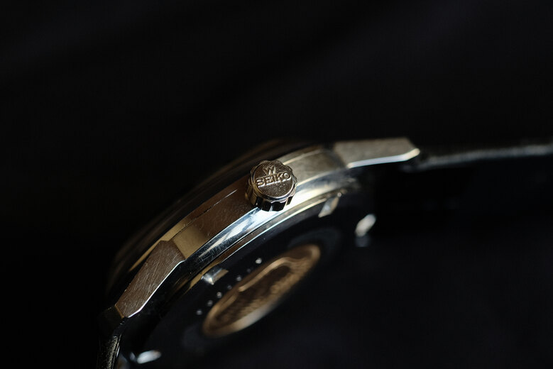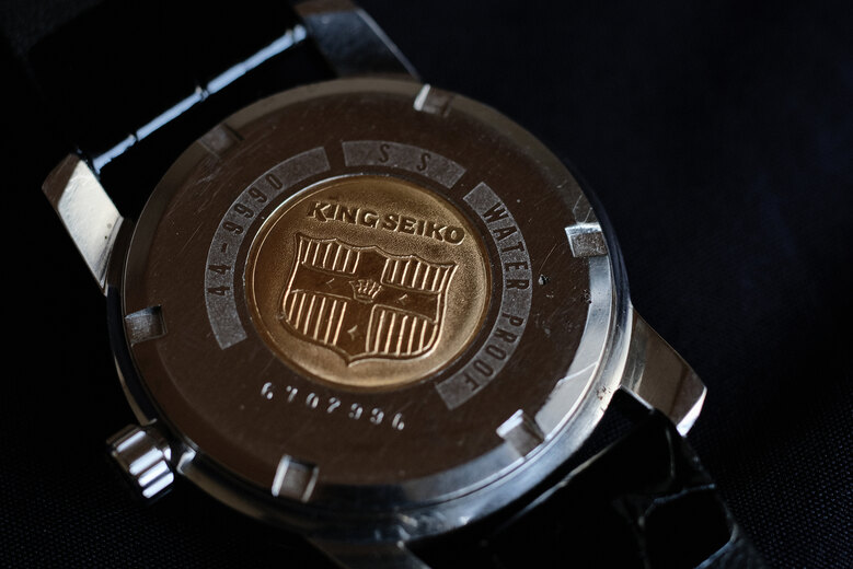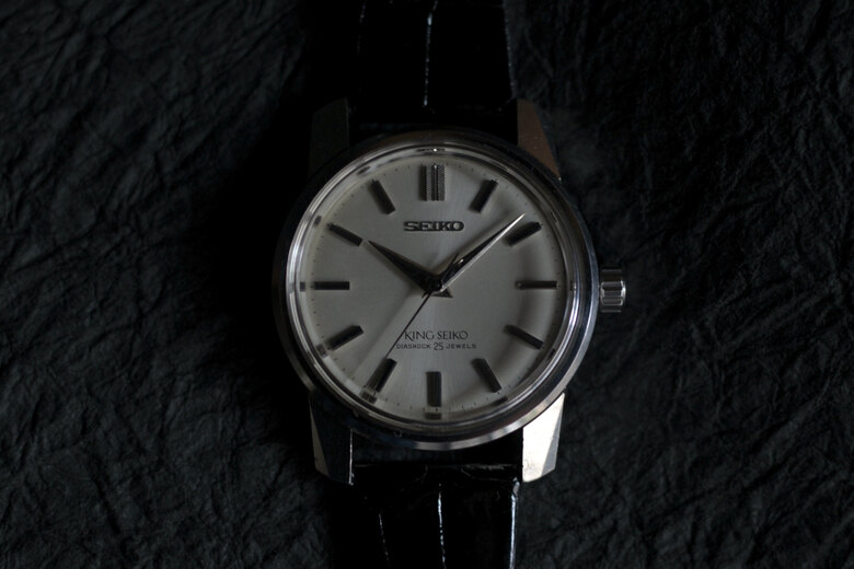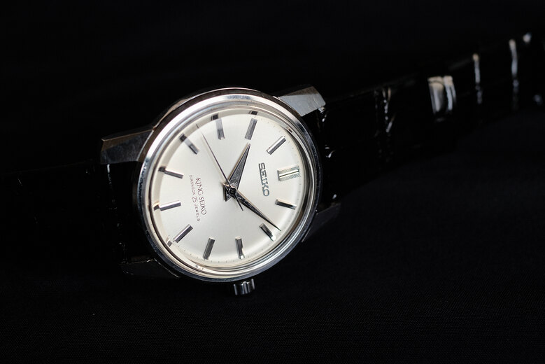 諏訪精工舎のグランドセイコーに対抗するべく1961年(昭和36年)に第二精工舎から発表されたキングセイコー。1stモデルを改良しハック機能を追加した通称44KSKと呼ばれる2ndモデルで1966年7月に製造された個体です。同じ44-9990モデルであっても製造時期によって文字盤やケース、ムーブメントに様々なバリエーションがあり、こちらは裏蓋の盾メダリオンやムーブメントに大きなカマ状のハックレバーを備えた初期型にあたるモデルとなります。一見ごく普通のシンプルなデザインに見えますが平面や直線を主体としたデザインは明らかにそれまでのセイコーウォッチとは異なり、後の「セイコースタイル」へと繋がる萌芽のようなものを感じさせます。力強くエッジの効いたラグ、大胆に平面を取り入れた長短針、見る角度によりきらきらと輝く多面カットのアプライドインデックス、トップをフラットに成型したボックス型風防とポイントで見ればどれもなかなかに主張の強いディテールですが、全てが完璧に調和しひとつの時計として成立しています。搭載するムーブメントは1958年(昭和33年)に第二精工舎初の独自設計モデルとして発表された「クロノス」の54系キャリバーを改良したもので、石数を25石まで増やしハック機能や微動緩急調整装置を追加するなどキングセイコーの名に相応しいハイエンド仕様となっています。