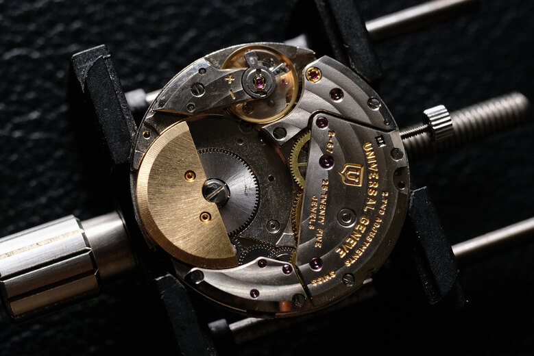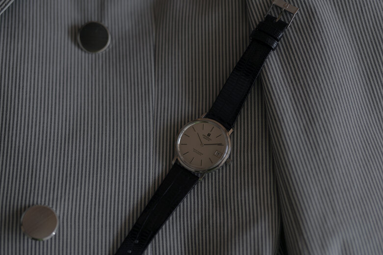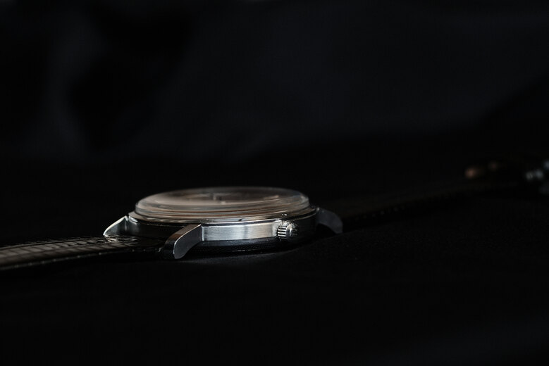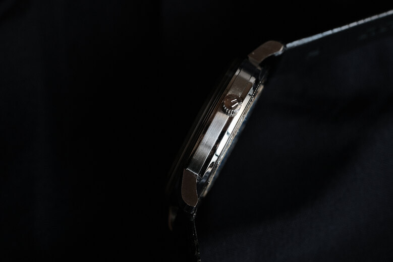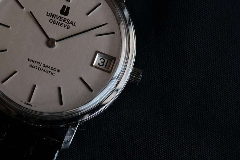 ポールルーターと並びユニバーサルジュネーブが発表した傑作薄型自動巻きモデルとして知られるホワイトシャドウ。巨匠ジェラルド・ジェンタが手掛けたデザインとして特に名高いCラインケースを採用したモデルをはじめ様々なデザインが存在していますが、こちらは中でもミニマルを突き詰めたといえるシンプルなラウンドケースモデルです。一見すれば何の変哲もないデザインに見えますが微妙に段差をつけたベゼルやサイドから見るとベゼルの傾斜から延長するように伸びるラグ、ポリッシュとサテンを絶妙に組み合わせてメリハリを持たせる仕上げなど細部に目を凝らすと至る所に凡庸とならない拘りが見て取れます。また、ホワイトシャドウといえばプリントのローマンインデックスがアイコニックなデザインですがこちらはバーインデックスタイプ。この薄さながら立体感のあるアプライドインデックスとなっており視認性が良く高級感もある端正なデザインです。搭載するマイクロローター式のCal.2-67はカレンダー付きの自動巻きムーブメントでありながら厚さは脅威の2.9mmで風防含めたケース全体の厚みもわずか8.2mmしかありません。しかもスナップバックよりも厚みが出やすいスクリューバックでこの厚さを実現しているのですから本当に驚くばかりです。この薄さと軽さのおかげで実現できる腕馴染みの良さもこの時計の魅力のひとつでしょう。ケース径も34mmと小振りのため性別問わず着用いただけるかと思います。使用においては巻き上げは手巻きも併用できカレンダーは23時から24時を往復することで早送りができるため実用性も十分です。