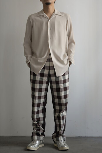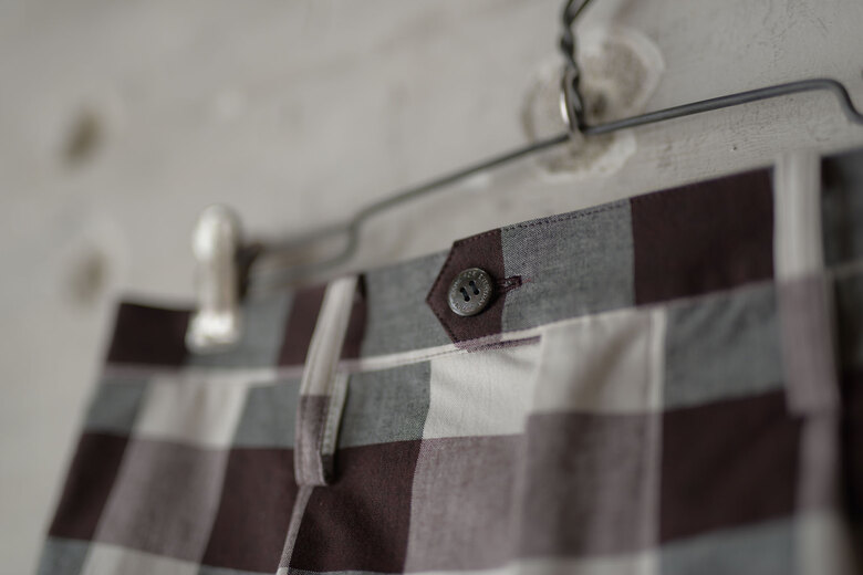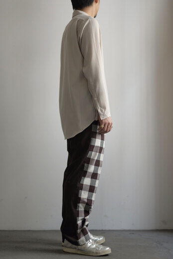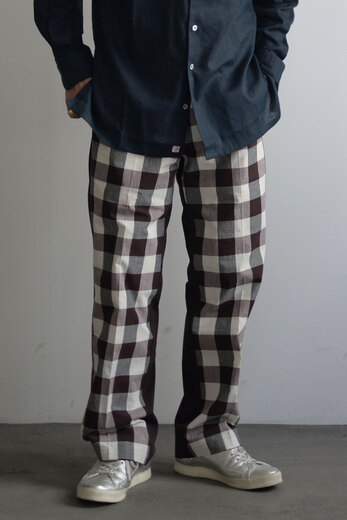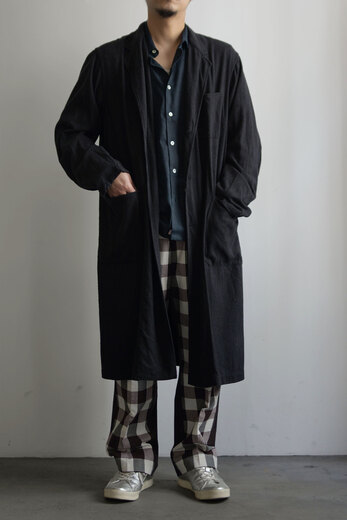 wellのSOMEONE’S CLOSETは歯科医のパンツから着想を得たそう。制服(ユニフォーム)は機能的な面も考えられており、格好付けていない格好良さがあるように思う。立ったり座ったり、そんな職業の動きに合わせて作られた機能美。それを普段使えば快適なはずである。前から見るとパジャマの様なチェック柄、後ろから見ると落ち着いたブラウンと前後でバイカラーになっている。視覚的な面白さもあってコーディネートするのが楽しいパンツだ。※コートもありましたが、完売しました。