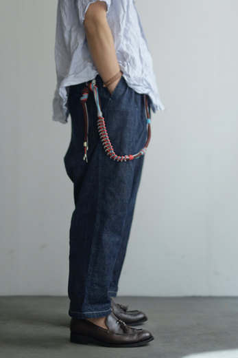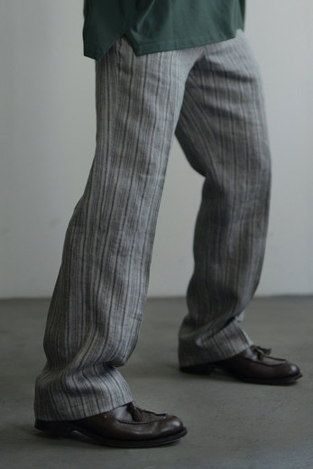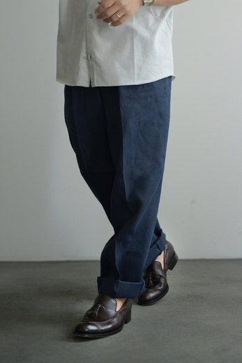 ヨーロッパの古いシャツが店頭に並ぶ事がある。自分で切って縫ったであろう極端に短く直線的な丈の物や綺麗に仕立て直した物、襟をカットした物など・・・。体型も変わるだろうし、気分が変わる事もある。どれも個性的で格好良いと思える物ばかりだった。コモリのポプリンシャツは昔のドレスシャツの丈を少し短くして普段着として使う、そんなイメージが沸いた。ハリのある素材は心地良く、光沢があり細いストライプは上品さも感じられる。そんなポプリンシャツをラフに着る事でその時代のシャツの空気感が出るような気がする。