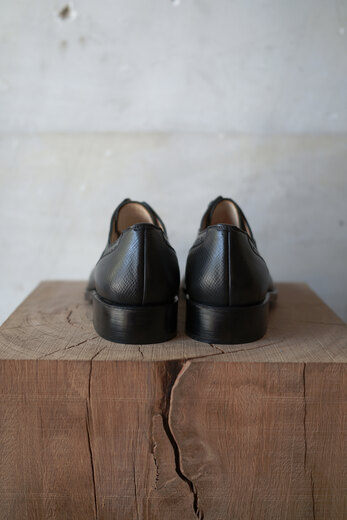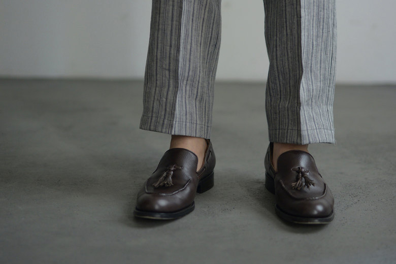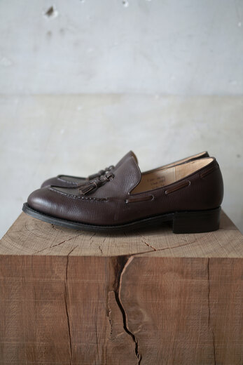開閉が複雑な鞄を開けたり閉めたり、靴紐を結んだりする時間。昔のヨーロッパの人たちはそういう些細な時間も楽しんでいたと聞いた事があります。それから物凄いスピードで発展を遂げ、便利になって時間に余裕が出来るはずが、そんな事も無く1日が48時間だったら良いのにと思いながら過ごしている。靴紐を閉める所作、個人的にはとても好きな時間。でも気が付くとスリッポンを履く頻度が増えていた。そんな中出会ったのが、そのみつのタッセルスリッポン。一枚仕立てで包み込まれるような優しいフィット感。そして軽くて歩き易く、踵が抜けにくい。素材はフランス、アルザス地方で作られたユタカーフ。ロシアンカーフを再現した、菱形の型押しが特徴的な革。型押しだと硬いイメージがありますが、オイルがたっぷりなのでとてもしなやか。革靴は人それぞれの変化があって・・甲の低い、高い人、幅の狭い、広い人。足の形は様々。自分だけの皺の入り方や色の変化があって履く度に愛着が湧いてくる。そんな特別な靴になってくれるのではないでしょうか。