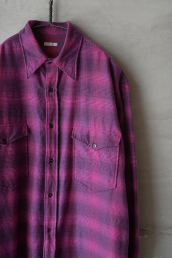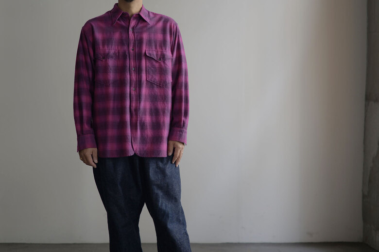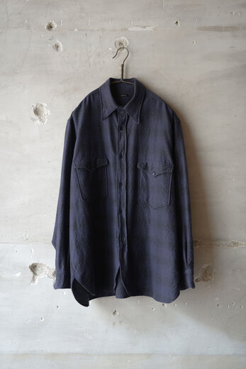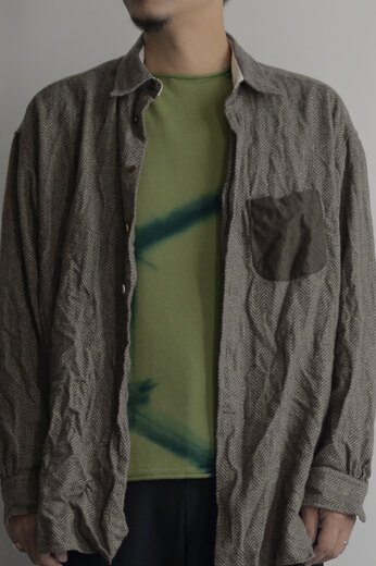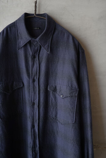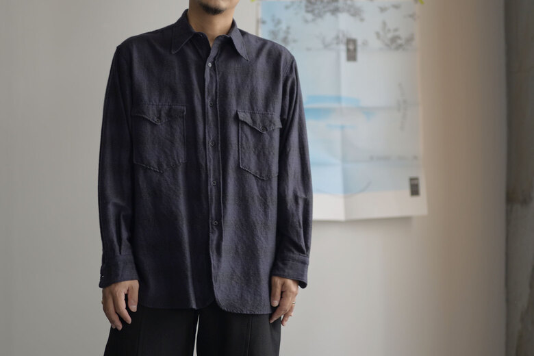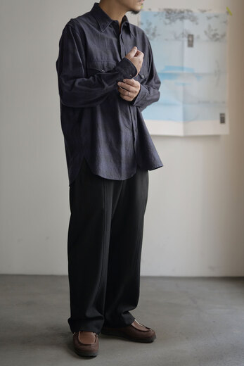 昔ながらのデザインから作られたワークシャツ。古めかしさもあり、新しい雰囲気もあって、どの世代の人が着ても馴染みそうな気がする。COMOLIの洋服は着ると何だか落ち着く。気楽に着てもラフにならないし、安心感がある。だからつい手を伸ばしてしまうのではないでしょうか。色んな面でちょうど良い、そんな風に思う。ウールシルクの空気を孕んだような膨らみがあり暖かく気持ちが良い。シャツとしては勿論、秋口には羽織る感じで着ても良さそう。