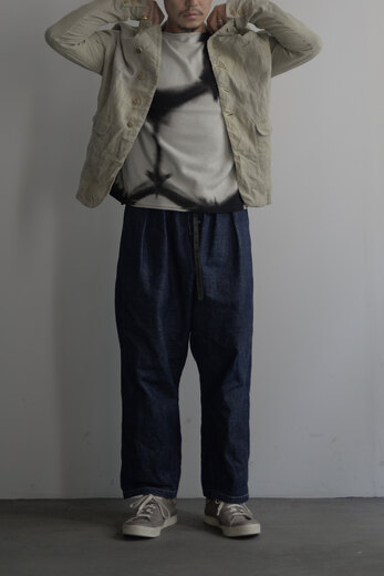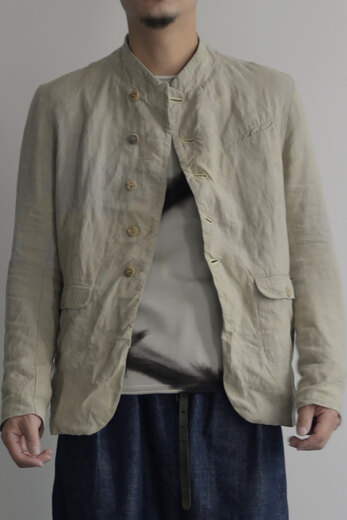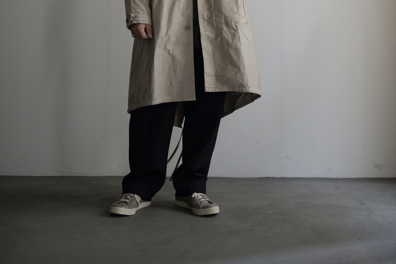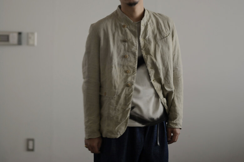 コモリの洋服は古いミリタリーをベースにデザインされている事が多い。軍物には様々な場面で使い易い事や可動域が広くて動きやすかったり、一つ一つ意味があり役割のある機能美が魅力な所でもある。このジャケットも古いミリタリーから着想を得ているが、削ぎ落とされたミニマムなデザインに上質なウールフラノを使う事によってより研ぎ澄まされた様な気がした。ちょっと綺麗に見せる事もできるし、崩してラフにも着れる。見た目は綺麗だけど、そんな気楽さもあるジャケットだ。
