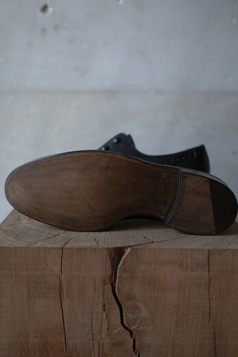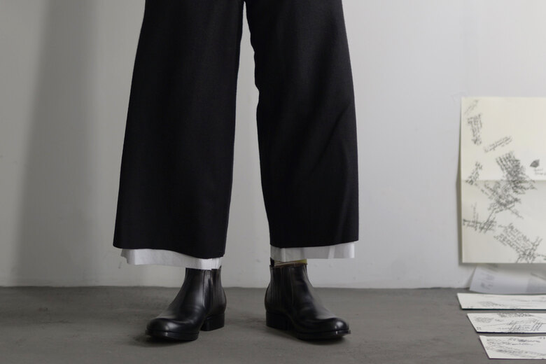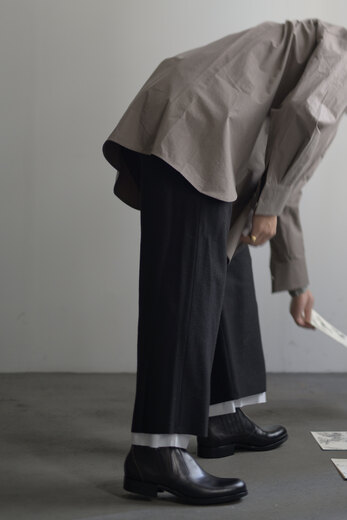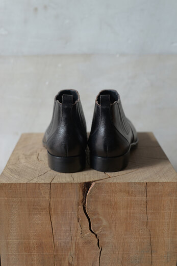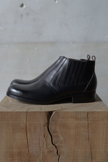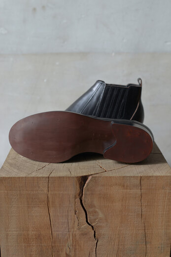 ペテロオラウムのオリジナルレザーであるCordvan Buttというコードバン層と銀面部分が混在した革を贅沢に使用している。1枚の革に凹凸が出て立体感があり表情のある面白い革だ。INSIDE MY GLASS DOORSでは彼らの作る03の木型を中心に取り扱いをしている。よりビスポークに近い作り込んだ仕様で革底がとても美しい。マッケイ製法を選んだ理由は軽さとコバが綺麗、そしてハンドソーン並に履き心地が良かった。今回のサイドゴアのブーツはミドル丈でくるぶし部分が丁度隠れる程で痛くならない。サイドのゴムはドイツのイエガー社の物でゴムとしての強度が非常に高くさらにエラスティックを配し補強している。長く履いていく程にダルっとなる”あれ”を最小限に抑える為だ。一見黒に見えるかもしれないが革の断面を見ると茶色が見える。実は茶色の革を黒に染めた新色なのである。限りなく黒に近い茶色。黒がお好きな方も茶がお好きな方も違和感無く履ける色ではないでしょうか。サイドゴアは着脱の多い日本ではある意味適した形とも言える。そしてデザイン上面が広い為、履き込めばコードヴァン特有の良いシワが入り、下の茶色が出てくる。経年変化も楽しみな革靴だ。真っ黒だと少し重いと感じる時に程良い抜け感が出せて合わせるパンツもトップスも幅が広がるでしょう。幾度となく言っている気がするけれど、良い靴は良い所に連れていってくれる。一度、本気で作っている人の靴を履いてみて欲しい。きっとその理由をわかってもらえると思います。