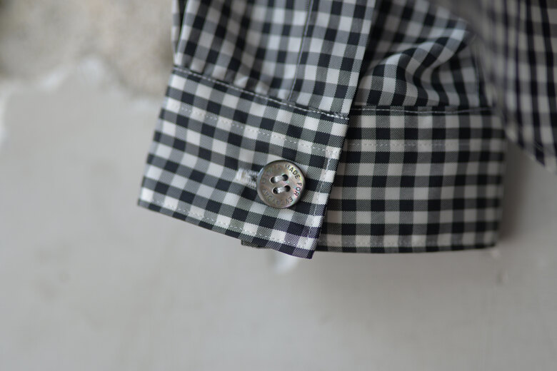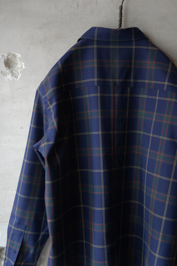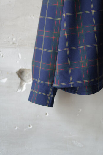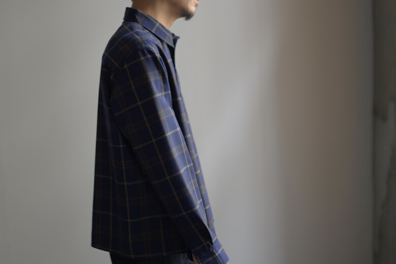 ヴィンテージを取り扱っていると、届いたシャツの背景を想像する。これを仕立てた人はかなりの肩が大きかった人なんだろうな。とか….職業は何か?どんな事を考えていたのか?とか……。まるで小説に出てくる主人公の事を勝手に想像してストーリーを考える様に。時々、デザインが極端に変えられたジャケットやシャツを目にする事がある。長袖が半袖になっていたり、その逆に袖が違う生地で伸ばされていたりする。そしてシャツがブツっと切られていたり…..このシャツは、デパートで普通に売っているおじさんのシャツをブツっと切っちゃった。そんなシャツ、がデザインだ。ボタンの一番下と裾の間が私たちがよく見るバランスではなく、本当に切ったままな感じなのが、wellらしくて微笑んでしまう。身幅は大きめだけど丈が短く、ウールギャバのレトロなチェック生地の雰囲気と襟の形とフォルムが良い意味でアンバランスなのが面白い。このチェックを見た時はCLASSのクラッシュしたデニムを合わせれば、絶妙な感じが出そうだと感じて入れる事にした。(デニムはもう無い。)寸足らずが今季のINSIDE MY GLASS DOORSのテーマになっているのだが(勝手にです)、絶妙なバランスというのをそれぞれで見つけて頂きたい。そう、様々な着方を自由に楽しんで欲しい。