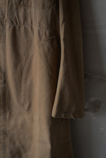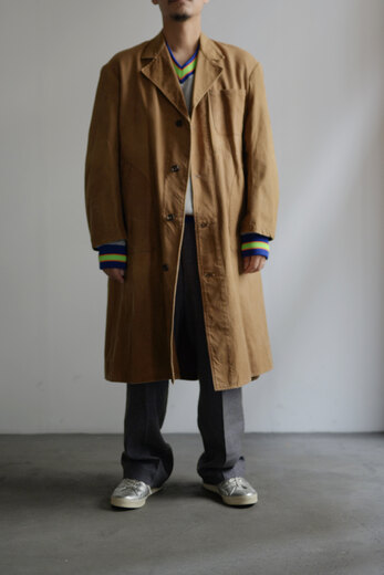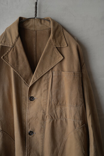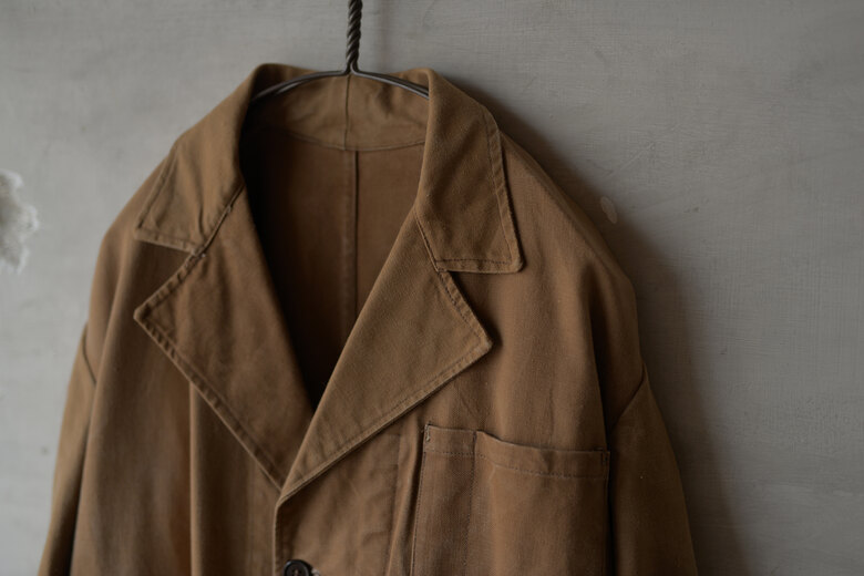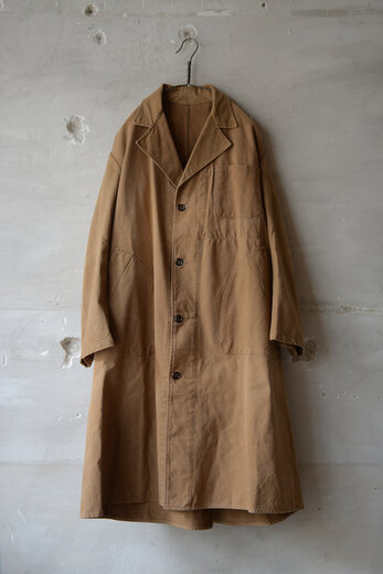 教職員が教壇に立つ際に着ていたコートを画家や芸術家が作業着として着用していた事からアトリエコートと呼ばれるようになった。当時の資料や写真で実際に着用している姿を見て、あの空気感に強く憧れのような感情を持った事がヨーロッパの洋服に興味を抱いたきっかけでもある。そんな原点のような洋服がアトリエコート。今回入荷したのは非常に珍しいブラウンキャンバスの生地。色は長い年月を掛けて程良くフェードしており、とても良い雰囲気だ。生地にはまだハリがあり状態はかなり良い。夏以外は着用出来る為、沢山着て経年変化も楽しむ事ができる。羽織るだけで印象がガラッと変わる、それはオリジナルだからこその空気感のおかげかもしれない。