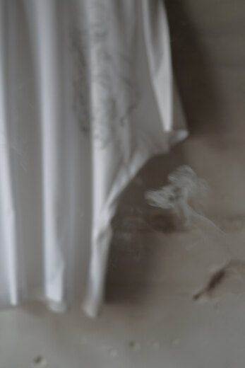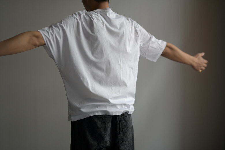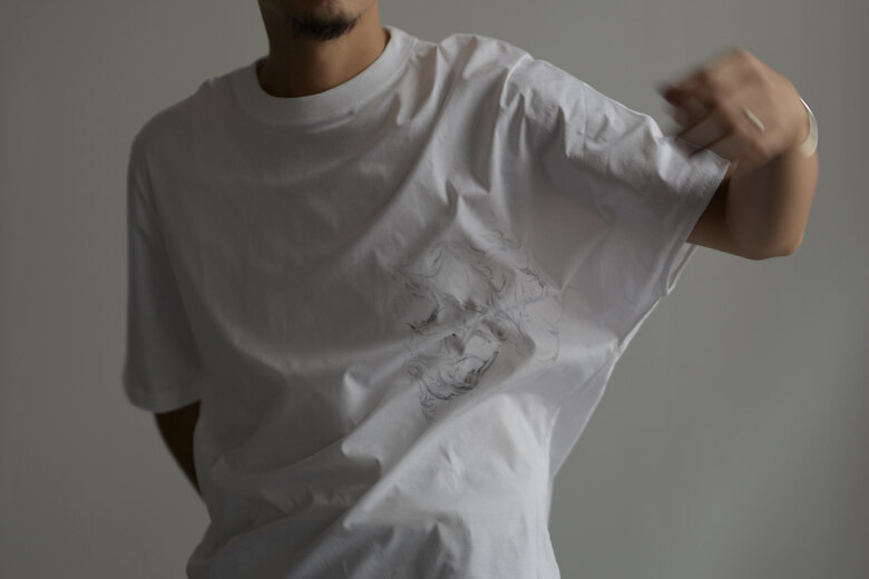 上品な光沢のある生地とアシンメトリーなデザインがとても大人っぽいNobuyuki Matsuiの定番Tシャツ。そのTシャツに煙をコンセプトにデザインをして頂いた。煙のプリントは1000年以上の歴史を持つ墨流し。水面に墨汁を垂らし、細い棒で動かしたり風によって揺らぎを起こしたり。1つとして同じ柄は出来ない、偶然出来た流れをプリントする技法である。空気に漂う煙と水面に流れていく墨をリンクさせてデザインされたそう。そんな技法であるが故に、イメージする煙になるまで何度も失敗を繰り返し完成した。仕上がりを見た時はまるでお店が1つのデザインとして具現化されたみたいでとても嬉しかった。冬物が沢山入荷してますが、すぐに着れるTシャツはいかがでしょう?