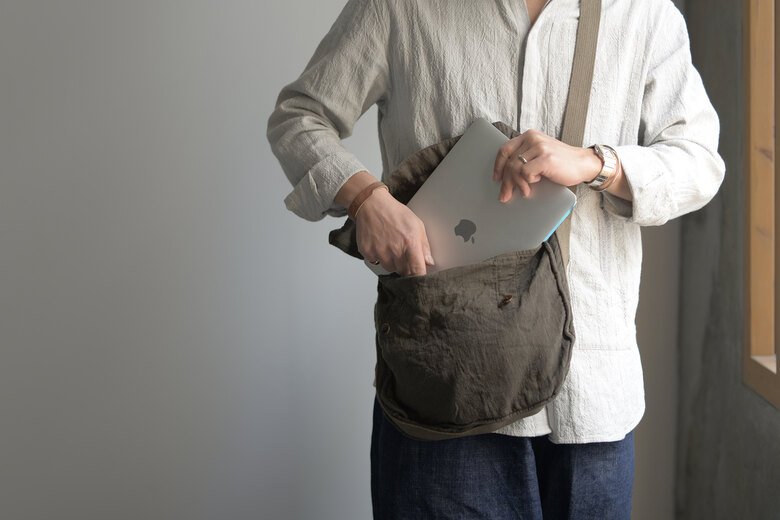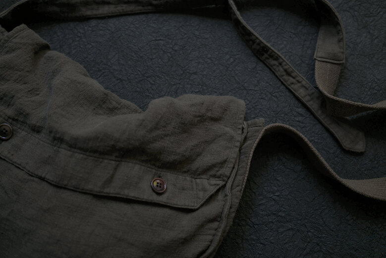鞄の中にはエコバッグが常に入っている。帰り道にスーパーマーケットに立ち寄った際、そこに買った食材を入れるためだ。最近使う事が増えたのがショルダーバッグやリュック。つまり両手がフリーになる鞄だ。手荷物が増え両手に抱えるのは少し大変だったので自然とそういう鞄を使う事が多くなった。The crooked TailorのBred Bagはその点使い易い。思いの外荷物がたくさん入りその割に大きく見えないし鞄自体の重量が軽い。ポケットも幾つかあり仕分けも出来て非常に便利だ。自転車に乗る時にも良さそう。そして洋服にも馴染みやすい。決して強調される事はなく、その人の一部になる様な・・・。どんな場面でも違和感がなく溶け込んでくれる。勿論生地や作りのクオリティはいつもながら素晴らしく持つ事で高揚感も得られる。しかしそれを表に出していない。能ある鷹は爪を隠すという諺があるが、そんな印象を受けた鞄だ。
