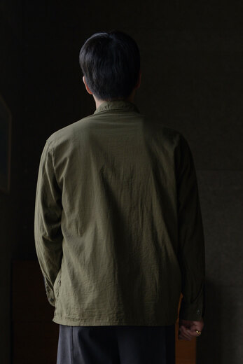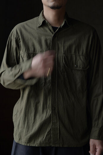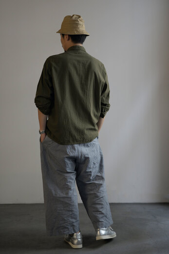 湿気の高い梅雨、1年で1番苦手な時期だ。まだ半袖にショートパンツは早過ぎるし、汗っかきの私は着る洋服(素材)に困る時期でもある。ここ数年、梅雨の時期から夏が終わるまで1番使う素材がコモリやYINDIGO AMのウール天竺とベタシャンだ。コモリのベタシャンは通常のシャンブレー(縦糸に色糸を、横糸に白糸を使った平織りの生地)とは違い、縦糸と緯糸少しの濃淡を付けた糸で織った平織の生地で洗い込んでも白っぽい色落ちがなく少しずつ柔らかな色合いに変化していく素材。ベタっとしたシャンブレって事でベタシャンとたぶん小森さんが名付けた。透けるほど薄く、実際に着てみると肌にも張り付きにくく、風が通り抜けてとても涼しい。汗をかいてもすぐ乾く。そして洗えば洗う程柔らかく、気持ち良くなり手放せない洋服の一つになると思う。デザインベースは軍物の定番CPO。取り入れ易く、すんなり馴染んでくれる。コモリ特有の肩の落ち方など、癖になる要素が実は多い。暑い季節も楽しむ術を教えてくれる、そんな洋服だ。