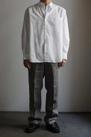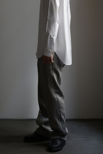 インディゴリネンストライプ。その言葉の響きだけで体が反応してしまう人がいるかもしれない。形は先日ご紹介したパンツと同型。ワイドなシルエットで丈は少し短め。フロントは2タック、共生地の紐を絞れば立体感のあるシルエットになる。石の削り出しボタンはほんのりインディゴに染まっている。穿き初めはハリがあってワイドさが強調されるが、ある程度穿いているとそれが落ち着いてきて柔らかくなる。そして歩いたり、座ったり、擦れる部分は少しずつ薄くなりインディゴ特有の濃淡ができる。夏は一度に着れる洋服が少ない。だからこういった経年変化を楽しむ事が夏を満喫する一つの方法ではないだろうか。