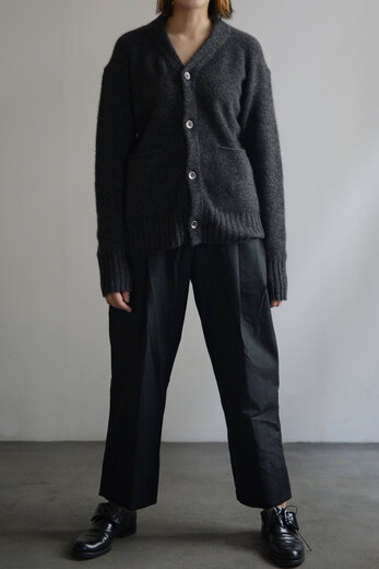 朝、いつものパンツを何本か穿いてみるとしっくりこない。代わりに綺麗なスラックスを穿いてみるもしっくりこない。そんな日が2-3日に1回はあって、決まってseya.のパンツに手が伸びる。涼しげなヘンプ100%、あまり触った事のない独特な触感に惹かれた。ヘンプは通常ガシッとした表情だがこの素材はシルキーというかヌメッとしているというか・・ヘンプと聞いていなければ質の良いリネンだと思ってしまうだろう。太過ぎず、細くは無い絶妙なシルエットで生地の落ち感もありとても上品だ。色名はINDIGO BLUEだがインディゴで染めている訳ではない。しかし奥の方にインディゴが感じられる深い色合いでとても美しい。実際に穿いてみるとキッチリした中に抜け感があってとても穿き心地が良い。一見キレイなパンツだがスニーカーやサンダルも似合う。まさに大人が穿けるラフなパンツだ。だからしっくりこない日にはseya.のパンツをよく穿いている。