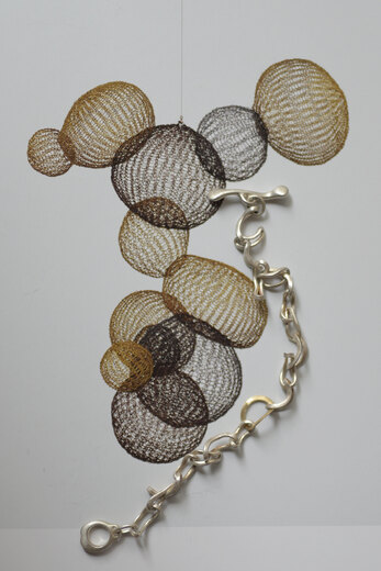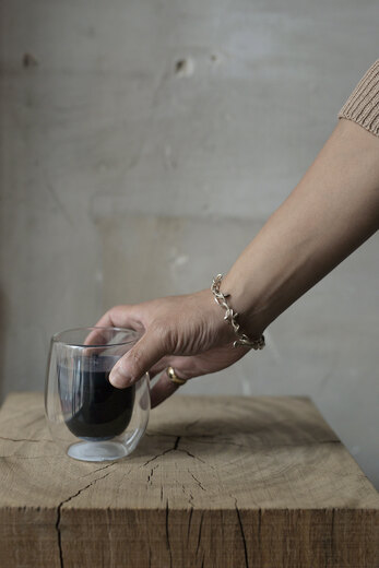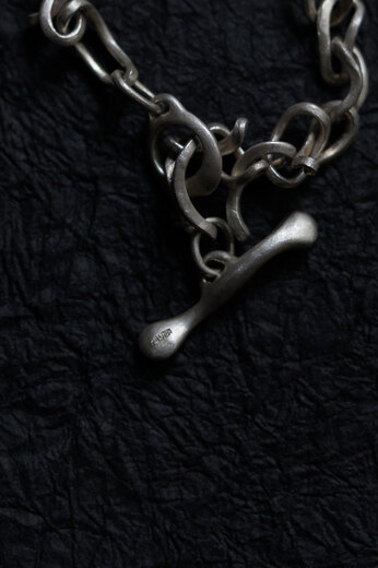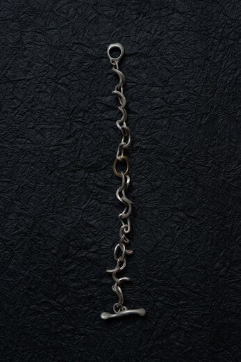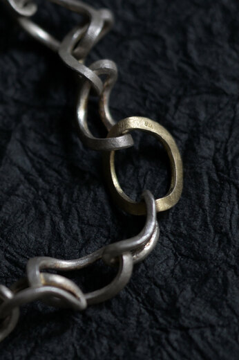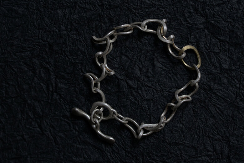 幼い頃、スリンキーというバネのおもちゃ(鉄製)でよく遊んでいた。好奇心からかそのスリンキーを伸ばし切ったらどうなるか、それがどうにも気になって気になって仕方がなくなった。きっと綺麗で直線的な棒になる、そう思い力一杯伸ばしてみると上を向いたり下を向いたり斜めになったり、とても歪な形になった。予想に反していたがその歪な形が妙に気に入ってしまい、捨てられるまで大事に持っていた。Nobuyuki Matsuiのブレスレットを見た時、どこかで見た事があるなと思っていてそれがスリンキーだった。歪んだ円が連なっている。型で作られたものではなく全て手作業だ。という事は同じ物は一つとしてない。ベースの素材はSILVER925、1つだけK18 GREEN GOLDが使われていて、そんなさり気なさも良い。不均一だからこその美しさがこのブレスレットにはあるように感じた。