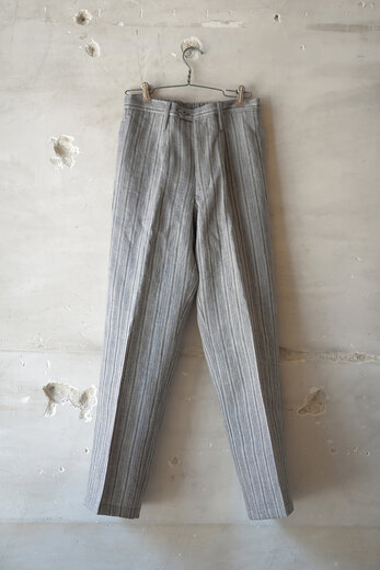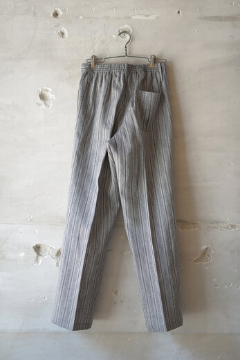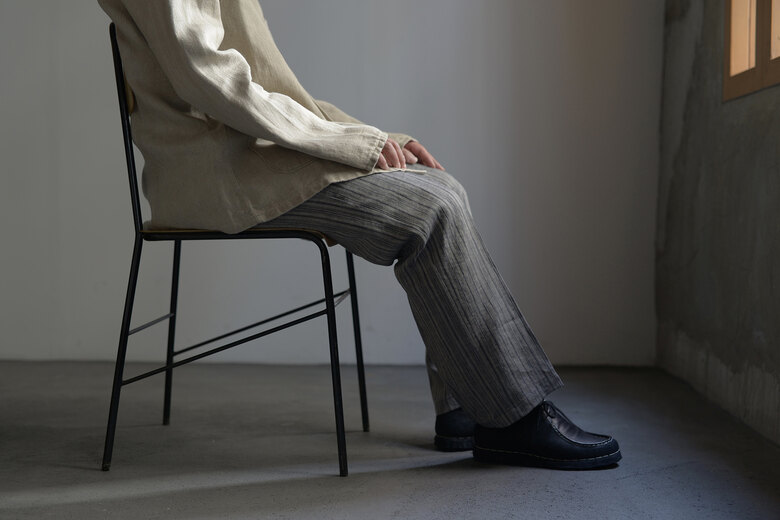 梅雨が明ければ暑い夏がやってくる。昔は我慢をしてデニムを穿いていたが歳のせいか耐えられなくなってきた。楽で涼しいパンツ、そんな物を求めるようになってきた。wellのSOMEONE’S CLOSETはキッチリ見えるのに動き易い。制服(ユニフォーム)は機能的な面も考えられた洋服。格好付けていない格好良さが制服にはあるように思う。このモデルは歯科医のパンツから着想を得たそうだ。立ったり座ったり、そんな職業柄の動きに合わせて作られた機能性。それを普段使えば快適なはずだ。素材は落ち感のあるプルプルのリネンで穿き込み甲斐がありそう。ウエストはゴム仕様でベルトが必要なく、楽だ。そして、とても穿き心地が良いく風通しも良い。クラシックなストライプも好みだった。