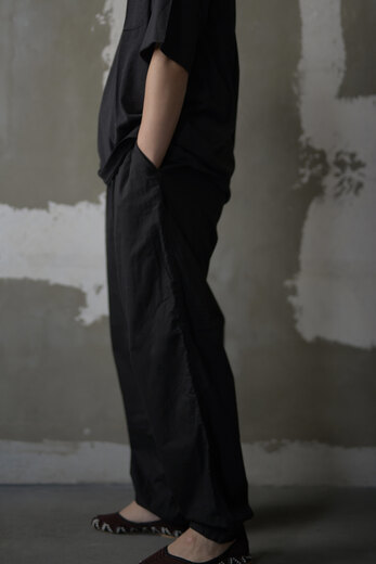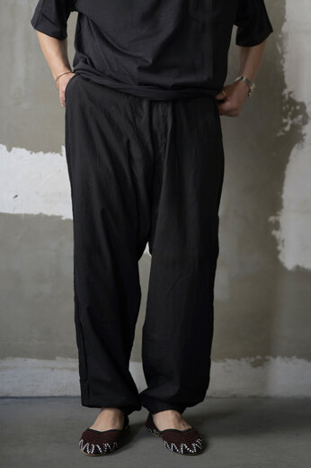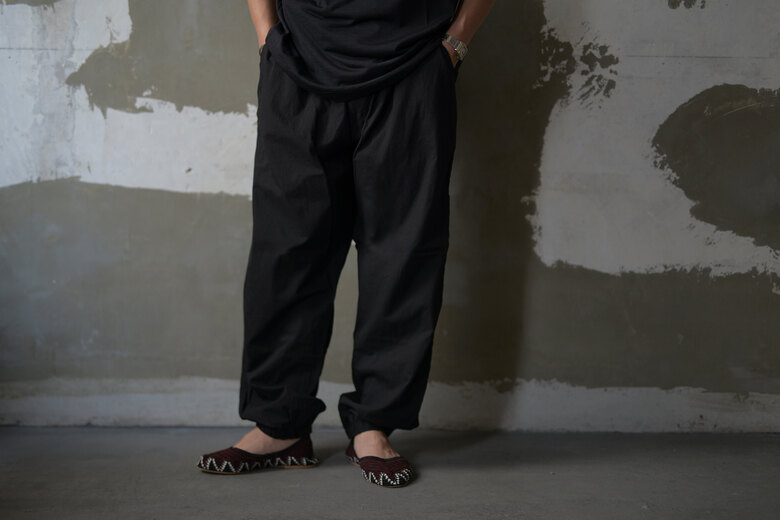 ウエストはゴムとドローコード、裾にもゴムが入っていて中に入れ込んでスッキリさせたり、裾を溜まらせて穿いたり。カディコットンの二重仕立てでとても快適なパンツ。カディコットンはインドの手紡ぎ、手織りの綿を言います。織ムラや節が残っていて、手作業というのを感じられる素材です。インドで使われる素材ですから、きっと日本の気候にもとても適していると思います。暑い夏、サンダルが似合うパンツです。