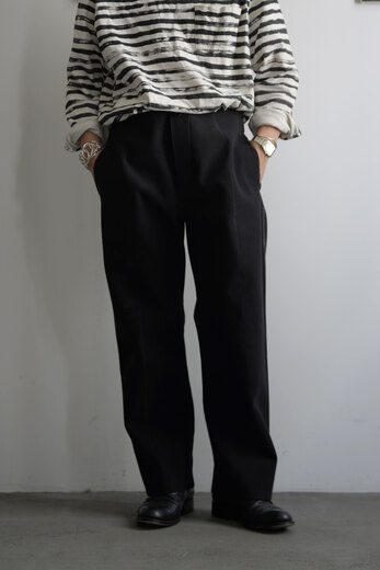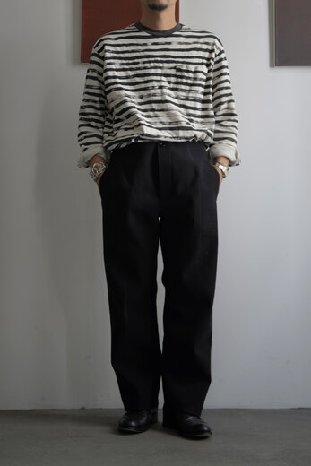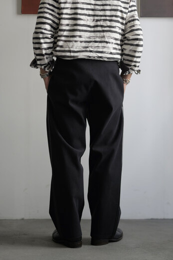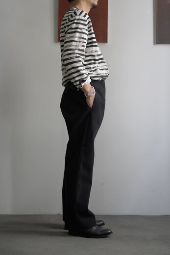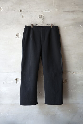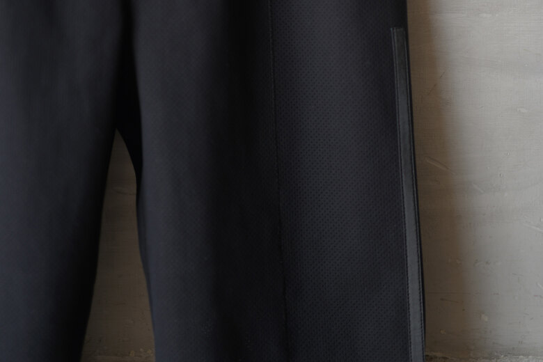 タキシード。同じ生地のジャケットと合わせて写真を撮りたいところだけれど、着れるジャケットはすでにお客様が着てくれているので想像して欲しい。タキシードなんて結婚式なんかでしか着る機会がないように思えるけれど、この感じだと中はTシャツやスニーカーと合わせてしまえば自分らしく着れる。という事で上下で合わせる事もお勧めしているが、単品で考えてみる。スラックスとTシャツを合わせる感覚でこのパンツを組み合わせれば涼しいパンツとなる。で、レザーのような見た目と上質さもある。すっごい遊びを知ってしまった大人。そんな言葉が合っている気がする。日々の物足りなさを感じている方々に是非とも色々なTシャツと合わせて欲しいです。