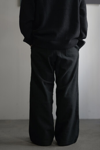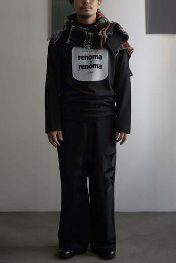 ただただ黒いパンツ、と思いきやパッチワークが施されています。シンプルだけどちょっと遊びがある。その塩梅が心地よく感じるのがスポメニックです。今回のテーマでもある木の床の寄木張りから着想を得た柄をパッチワークしています。パンツ本体の素材はポリエステルではありません。分厚いコットンを両面から起毛させたというその生地はまるでウールのようなぬくもりを感じました。着用すると肌がフリースに包まれる感覚になり、コットンなのにコットンではないような。そんな矛盾が妙に心地よく感じます。ストンと落ちるシルエット、穿き心地はまるでスウェットパンツです。