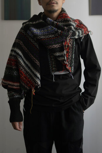 袖を通す、通さない。片方だけ通す。ただ首に巻くだけ。そんなふうに想像力を掻き立てられて、思わず色々と試したくなる洋服です。格好良い洋服を着て高揚するという感覚とは少し違い、ワクワクする――「ワクワクしたい」と言う方がしっくりくるかもしれません。「どうやって着るの?」と思うかな?といくつか例を写真でご紹介しています。けれど、実際に使っていくうちに、僕たち自身もまだ気づいていないような着方や巻き方に出会い、「なるほど!」と新しい発見がある気がします。そんなワクワクを与えてくれる洋服は、そう多くはありません。Kota Gushikenのデザインを柔軟に受け止める Jamieson’s とのコラボレーションによる一枚。さらに、Jamieson’sのかわいいコースターが1つ付属しています。きっと使う人それぞれの工夫や発見が加わって、さらに面白い存在になっていくと思います。