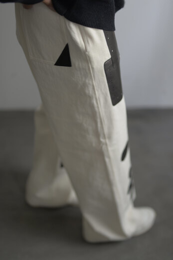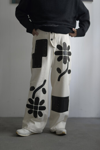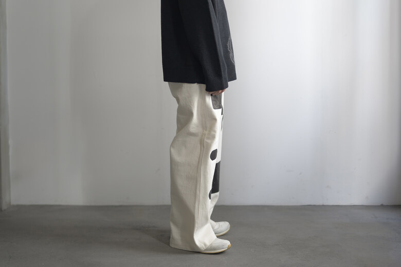 花や鳥。本来は可愛らしいはずのモチーフなのに、不思議とそれを超える「格好良さ」を感じました。それはカウレザーという素材の持つ重厚さから来るのか、あるいはモチーフの大きさや配置のバランスによるものなのか。おそらく、これこそが“デザインの力”なのかもしれません。甘織りの柔らかなホワイトデニムに、カウレザーでパッチワークを施した一本。洗いをかけクッタリとしたデニムと、レザーの質感。その対比が面白いと思いました。すべてアトリエで時間をかけ製作された特別な一着です。