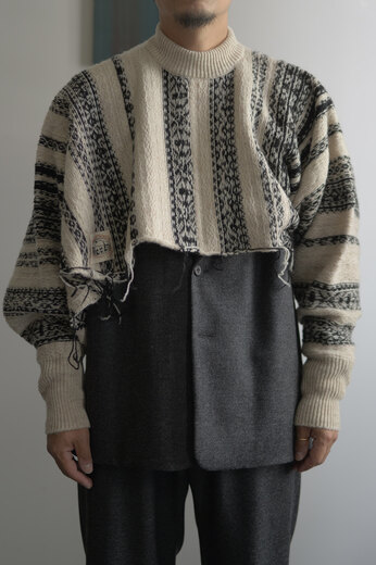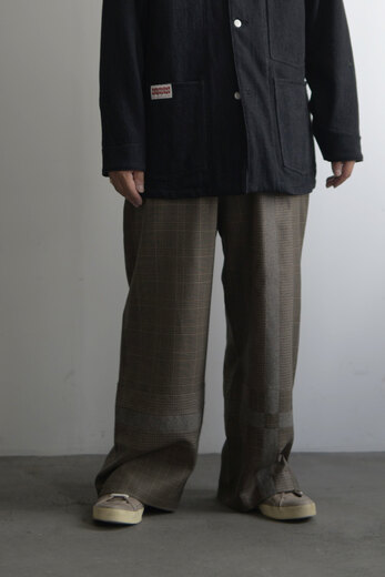 一見シンプルなスラックスに見えました。ドレープが効きそうな柔らかい生地でその雰囲気に先ず惹かれました。よく見ると近い色調の異素材が使われていてチェックが重なっているように見えました。初めにオリジナルのチェック柄を作り、パンツの大きさいっぱいに拡大します。そして異素材を使い前後にチェックを施したそうです。小さなチェックと大きなチェックが視覚的に交差し、調和の取れたスラックスです。総パーツ数98という想像できない工程を経て完成しました。