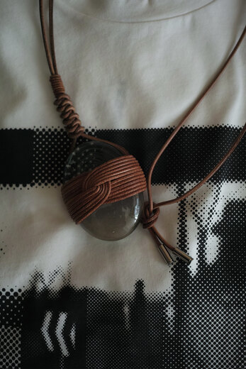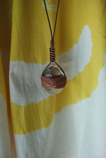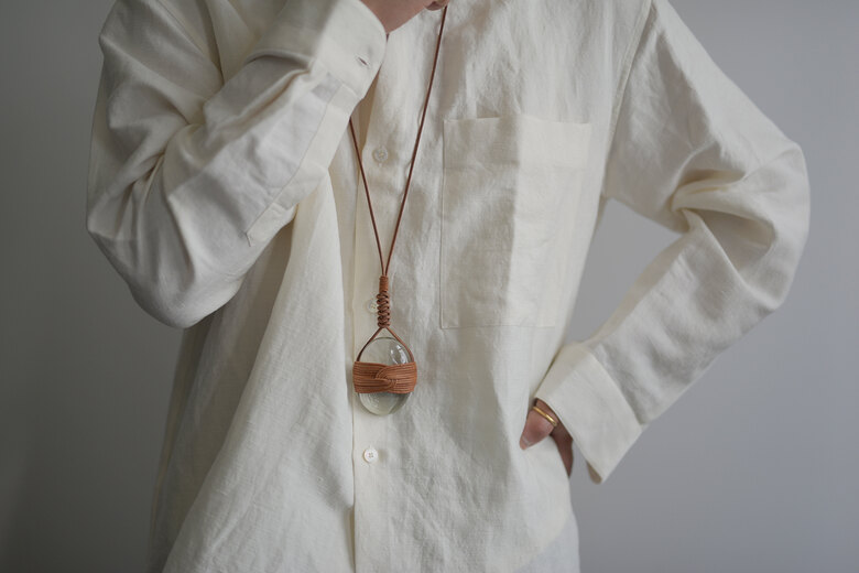 日本には包むという文化があります。荷物を運ぶ為に包んだり、贈り物や借りたものを返す時に包んで返すことがあります。その行為に含まれているのは感謝の気持ちです。そんな伝統的な包む文化を大切に、現代の包みの価値を考える活動をしておられる” HOW TO WRAP “とのコラボレーションです。沖縄のアトリエ”てとてと”で廃瓶からハンドメイドで作られた再生ガラスに革紐で伝統的な結びを行ったネックレスです。透き通った再生ガラスと一本の革紐から成る結び。実用的なネックレスではありますが、アート作品のような魅力があります。お客様は壁に掛けたいと言われていました。それぞれ自由に、所有した人の日常に溶け込んでくれたらと思います。