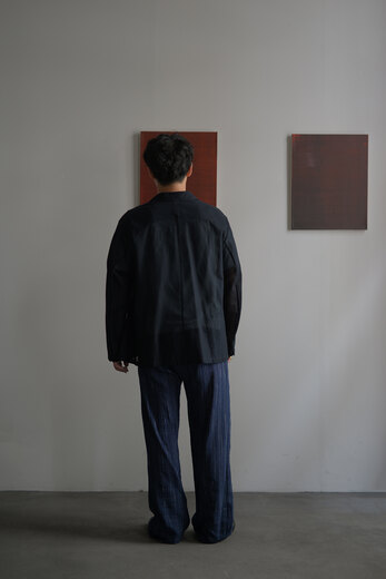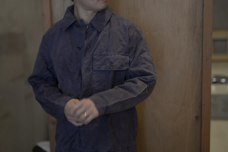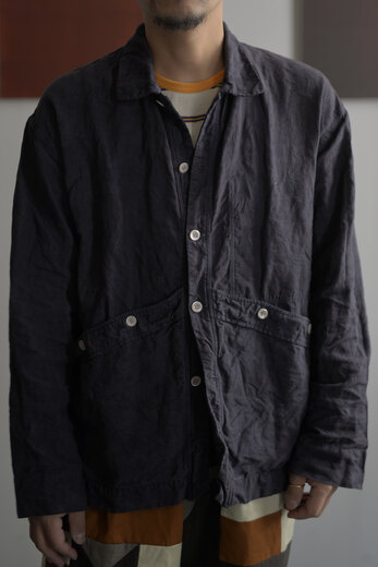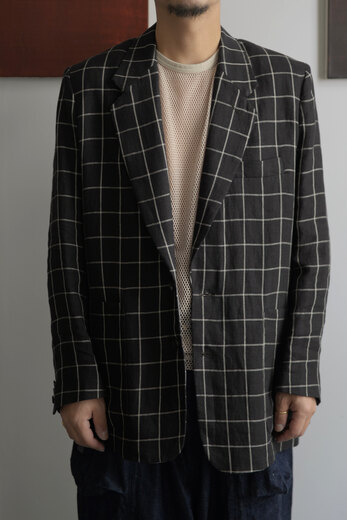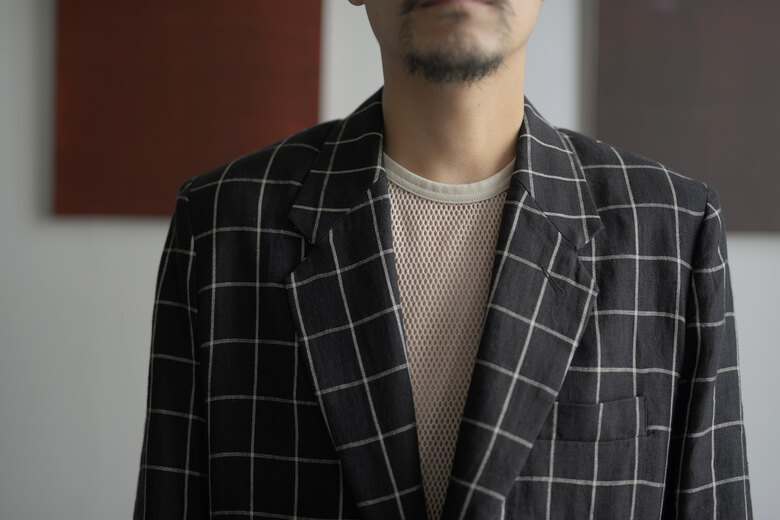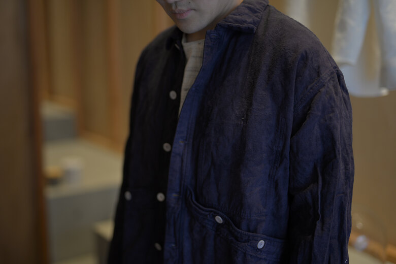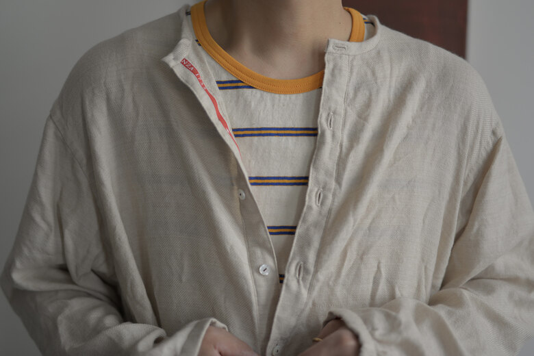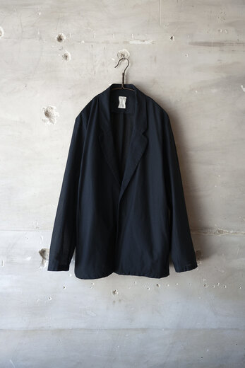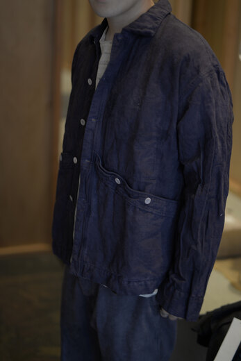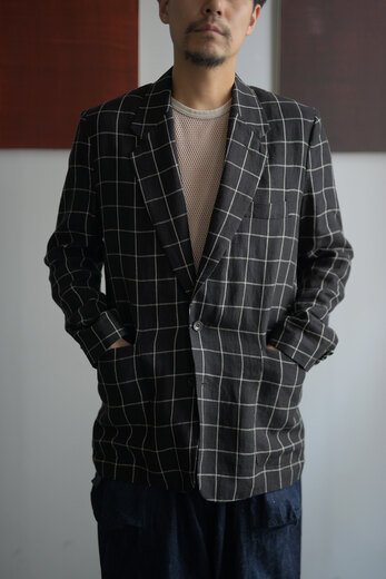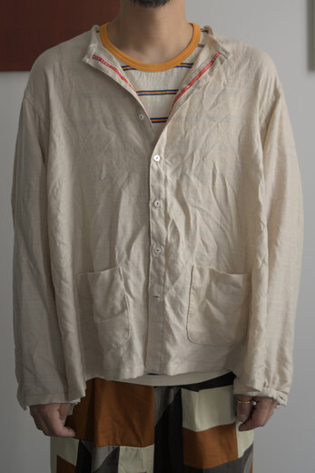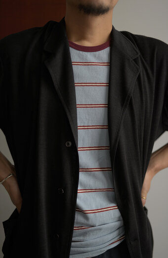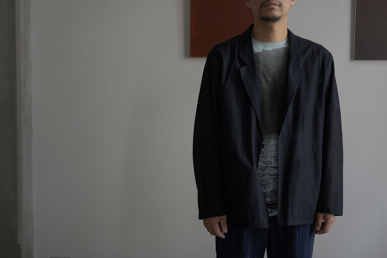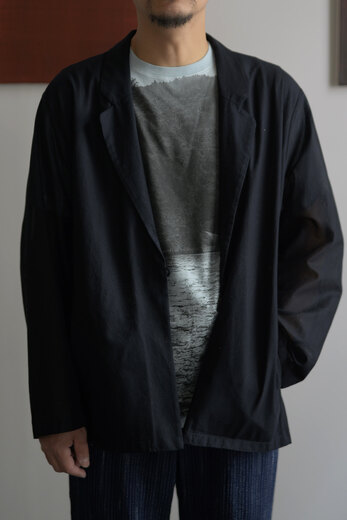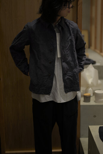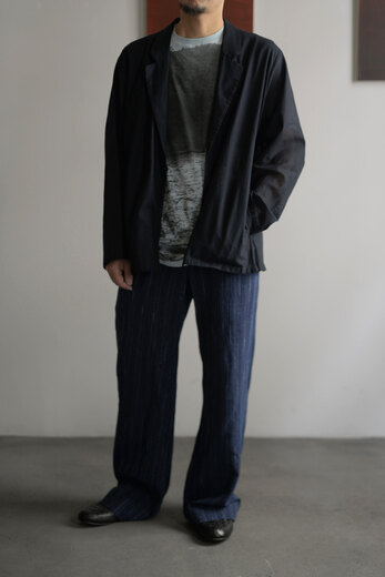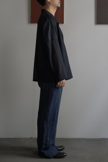 TOTSUKAWAのコレクションの音楽を制作したミュージシャンの冥丁さんの名前の付いたジャケットです。日本の技術である絡み織り。ストライプのシースルー素材で生地の向きがバイアスになっているので、風や動きに合わせて揺らぐさまが美しいジャケット。一枚仕立てなので、風が通り抜け涼しく感じます。