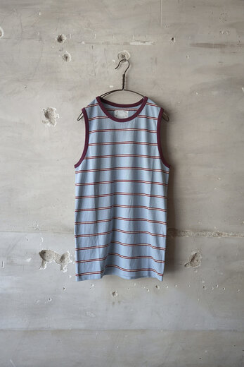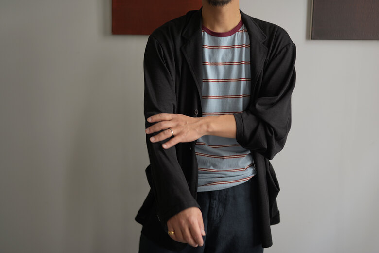夏にもジャケットを羽織るにはどうしたら良いだろうと考えた時、インナーを薄くする。という結論になりました。半袖だろうが長袖だろうが、真夏は何を着ても暑いのには変わりません。それなら暑苦しく見えないジャケットやシャツを、好きなものを着た方が絶対に楽しいと思うのです。そんな時にBLACKBIRDのタンクトップを見つけました。昔古着にあったようなレトロなボーダー、首元や裾からチラッと見せたりあえて透けさせたり。いつものシャツ、ジャケットの印象が変わり、新鮮な気分になれるのではないでしょうか。