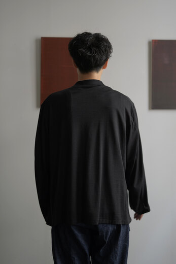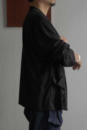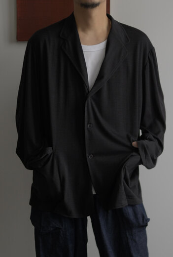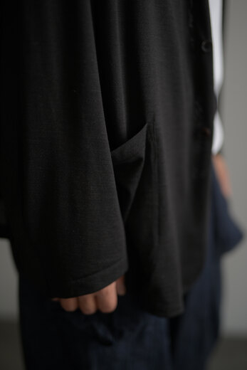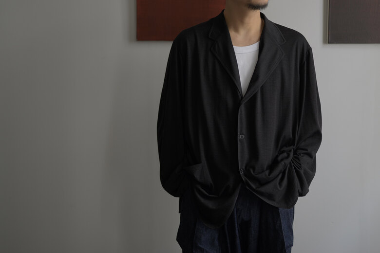 夏の必需品でもあるウール天竺。Tシャツの生地でジャケットができました。生地をたっぷり使っているので、落ちる感じ、ドレープがとてもキレイです。ウール特有のチクチクは全くなく、暑くなっても寒くなっても快適な状態をキープしてくれます。一枚仕立てなので、カーディガンの感覚で羽織れます。汗をかいても安心、汚れても洗濯機で洗えるから安心。汗っかきの強い味方になれると思います。