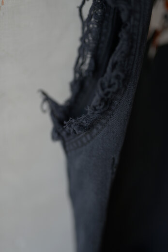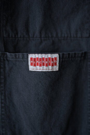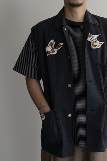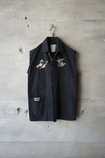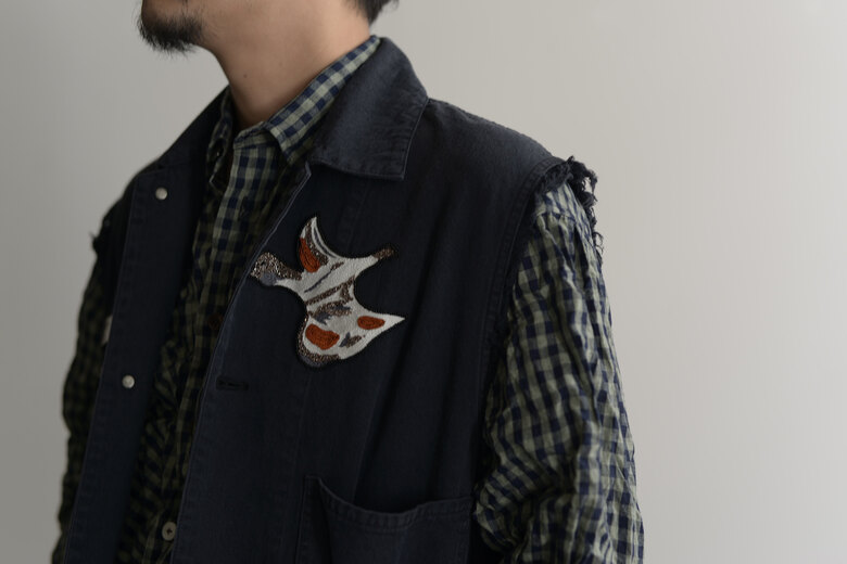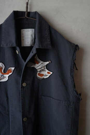 古い時代のワークウェアのカバーオールの袖をカットオフしたベストのような洋服です。袖があると無いとでは印象が変わります。少し暑くても着ることができるし、シャツやTシャツ一枚だと物足りないなと感じる時に着ると落ち着きます。胸にビーズと刺繍で装飾された鳥のモチーフはインドにて手作業で作られています。ボタンを留めると2羽の鳥がキスをするような配置にしたそうです。ボディはストーンバイオウォッシュ加工で使い古されたような雰囲気に。まるでアクセサリーのような感覚で羽織れる袖のないカバーオール。