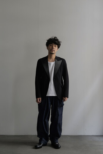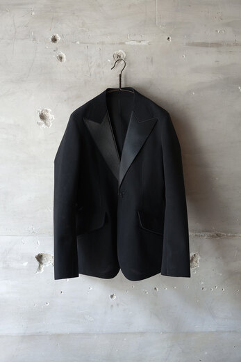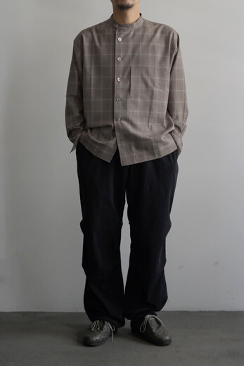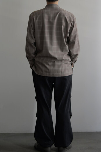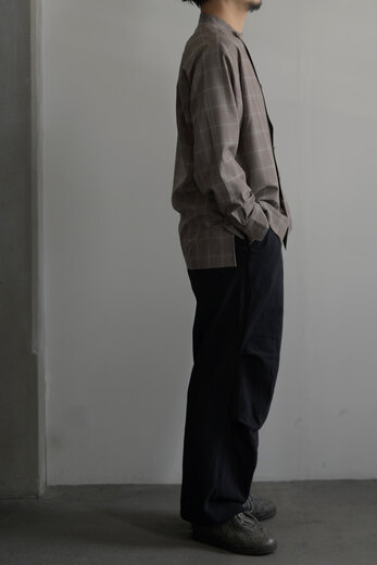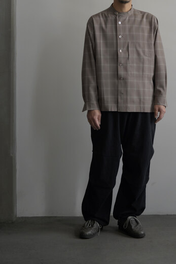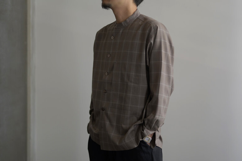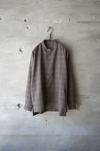コックシャツのような雰囲気の新型シャツです。トラウザーズと同じSuper140のウールトロピカルで細い糸の織物の為、表面はとても滑らかで涼しい。その特有の滑らかさがドレープを生み、風を余計に心地よく感じさせてくれます。実際にタンクトップの上に着てみました。外を歩くと風をしっかりと感じられます。少し日差しが強かったこともあり、とても気持ち良かったです。少しズレたフロントのデザインとボタンの大きさのバランス、シャツとジャケットの中間のような気がしています。ポケットも出し入れがし易いです。前から見るとセットイン、後ろから見るとラグランスリーヴ。スプリットラグランです。肩周りはスッキリ見えるけど動き易い作りです。僕みたいに肩が大きい人にも嬉しい作りでもあります。同素材でセットアップでも良いかもしれません。自由に、春の気候を楽しんでもらいたいです。