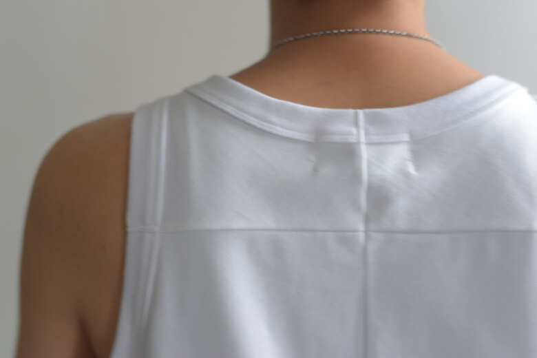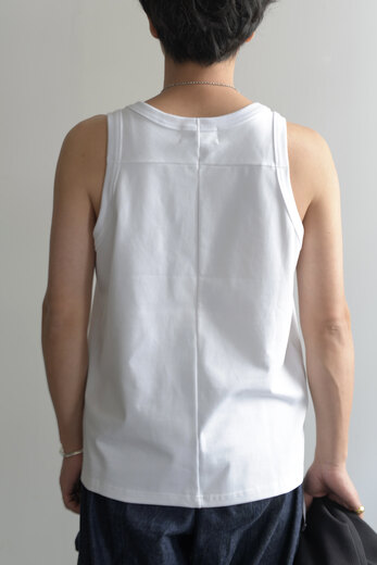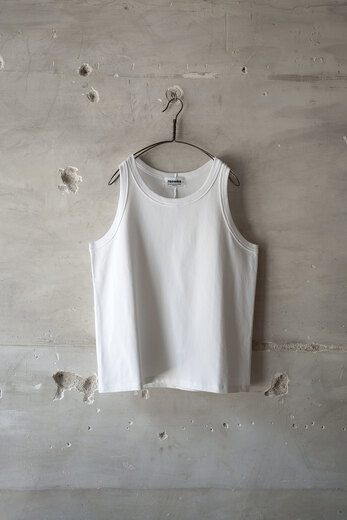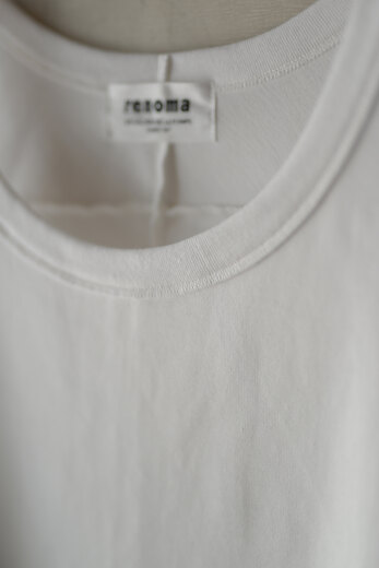 何年前だったか忘れたけどお店OPENしてまだ早い頃に、けっこうな大人が着れる、普段着(家着)になりすぎないTシャツみたいなのが欲しいと探しては仕入れてをしていた時期がありました。長くご愛顧いただいているお客様はふむふむと思い出して頂けるかと…で、もっと袖が短くなってタンクトップをここ数年探しては仕入れている。タンクトップにジーパンの上にバサっと”それなり”のジャケットを羽織って街を歩くなんてすごく都会っぽくて大人で昼でも夜みたいでカッコ良いなと憧れたりしていたけど、昔憧れていたその年齢にも近づいてきて、追い越したりもしていて、着てみると追い付いていて、あれ?着れる。ってなってる。グッと背伸びして着る憧れもあって良いし、けっこうな大人になったと堂々と着るのも良い。何はともあれ、renomaのタンクトップは持っていたい気分にさせてくれました。
