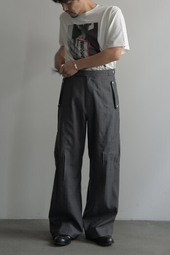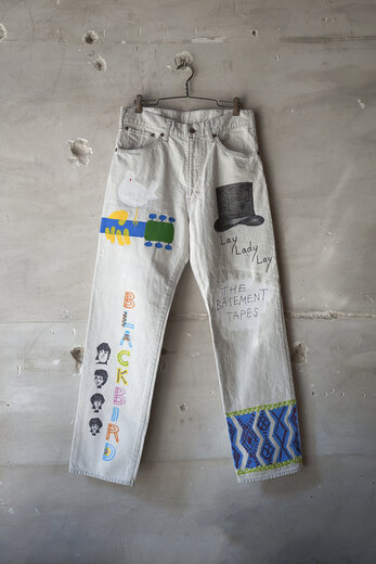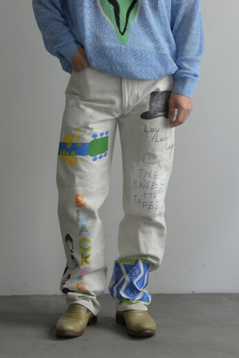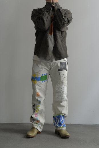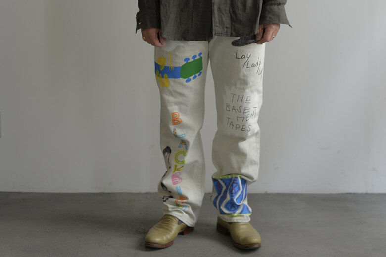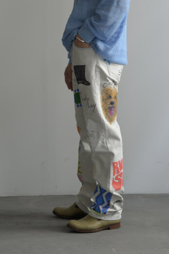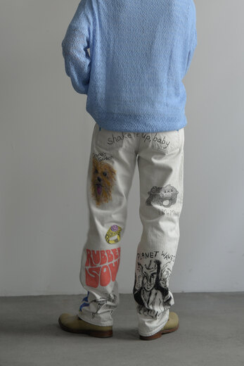 デザインは定番のStraight denim pantsと同型で、少しテーパードしたシルエット。ウエストに対してはお尻周りにゆとりがあります。だからウエストをジャストにするとお尻が突っ張るという事がないのです。12.5オンスのブリーチ加工したデニム、80-90年代のアメリカ製のデニムの雰囲気を再現したそうです。デザイナーの”好き”が垣間見えた気がしました。その”好き”をキャンバスに見立てたデニムにハンドペイントを施しています。沢山のモチーフがあります。じっくり探してみると”好き”が見つかるかもしれません。