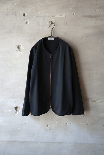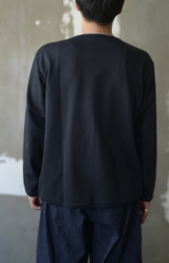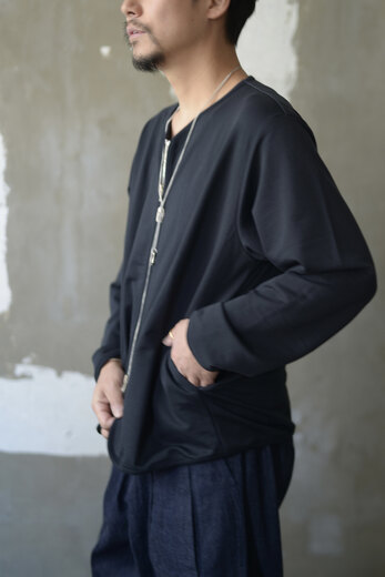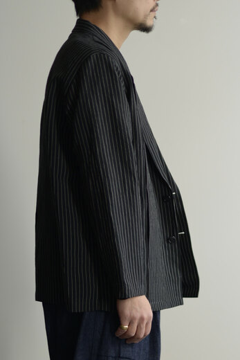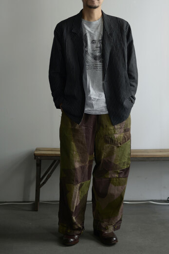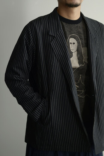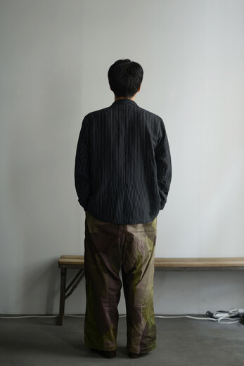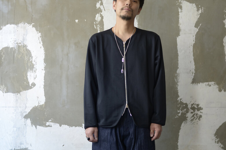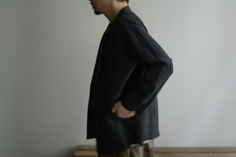 とても良さそうな生地に見えたので触ってみた。少しひんやり。サラッとして。麻のようだけど何かが違う。聞くと元々は着物の生地だそうで、麻と竹の繊維から作られたレーヨンを合わせているらしい。最近竹の生地が気になっていた事もあり、袖を通してみる。肌触りが良い。生地に多少凹凸があり、風通しが良さそうなので、暑くても着れそうだ。着物というワードが頭に残っていたので、テーラードジャケットではあるけど少し和な雰囲気も感じたり。リラックスした気分で羽織れる。ポケットはスラッシュポケット。フロントは折り畳んで留めてある。着物の生地ということは幅が細いと思うので、なかなか難しいことをあえてしているのか。いや、折り畳むことで裁断しなくて良いし、生地の無駄が少なくなるのではないか?でもフロントに厚みが出ることで良いドレープになっているし、この膨らみは絶妙だな・・と試着しながら色々考えている。