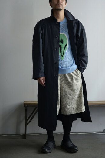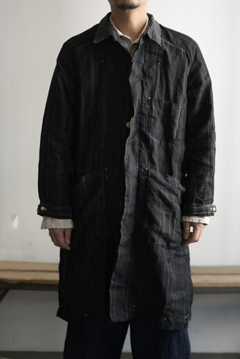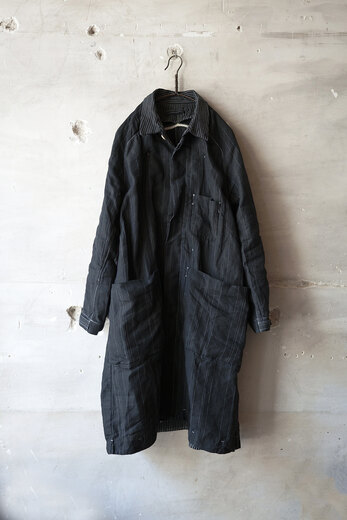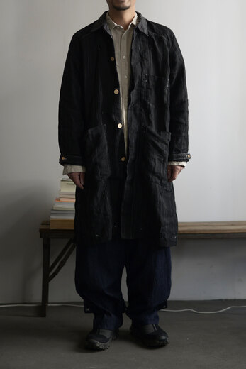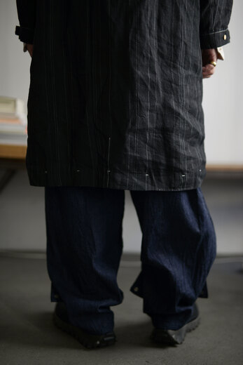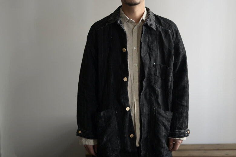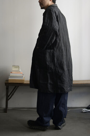 春にコート。ここ数年は暑くなるのが早くて着る期間が少ない。僕自身もそう思っているし、お客さんからもそういう声を聞く。しかし春のコートは魅力的な生地が多い。だから秋口にも使えるコートを探すようになった。当たり前だが冬はウールや厚手のものが多い。秋冬のコートを春先まで、というよりも春夏のコートを秋に、と考える方がリアルに感じられる気がする。お店をオープンした時に薄手のリネンで茶色のコートを販売した。それは暑くなってもTシャツやノースリーブの上に羽織れた。秋口にはジャケットやニットと合わせているお客さんもいた。そんなコートが1番良いんじゃないか。その代わりも欲しい。という訳でPROJECTbyH.の新作、LARRYを作ってもらう事にした。ランダムなストライプのヘンプはとても雰囲気のあり日本人にとっても馴染みのある生地。糸の硬さは安心感があり、その糸を甘く織っているため風通しが良い。着る度に体に馴染んでいくのがわかる。今回からHステッチを廃止した。自由に、より大胆に創造できているように感じる。心地よさと経年変化。着る、楽しみのあるコートだと思う。