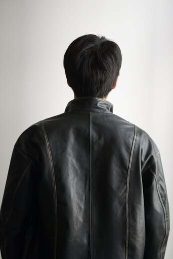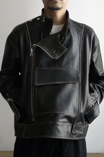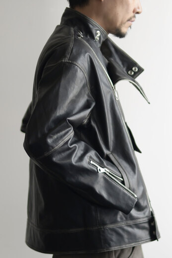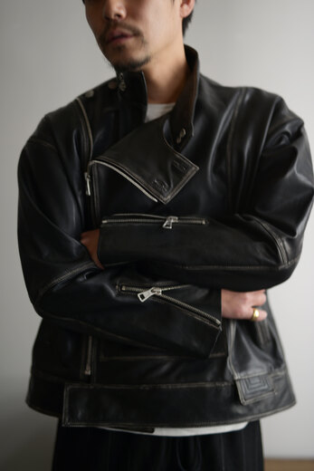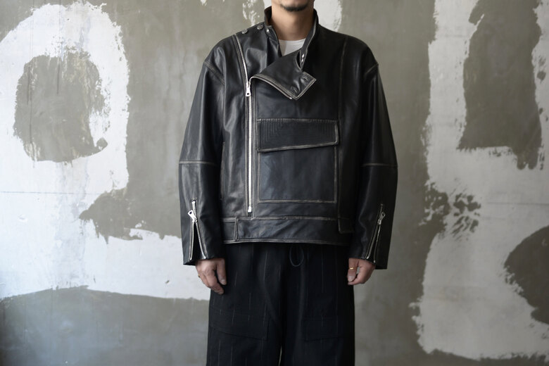 これってもしかしてスウェーデン軍の・・・と聞く。思った通り僕たちが大好きなデザインがモチーフのレザージャケットだった。オリジナルの香りは残しつつ、daisuke tanabeという洋服に昇華されている。そんな風に感じた。僕はレザーのライダースが似合うと思ったものに出会ったことがない。でも良さそうだなと思って袖を通してみる。すると妙にしっくりくる。軽くて優しく包まれるような。これはレザージャケットの着心地とはまるで異なる感覚、初めてと言っても良い気分だった。しなやかなゴートレザーにダメージ加工を施し、古びた雰囲気に。この小慣れた雰囲気は着易さの一因かもしれない。ジップはスイスのriri。これも文句の付けようがない。また欲しいものが見つかってしまった。