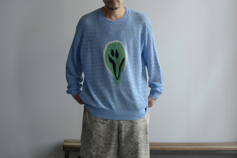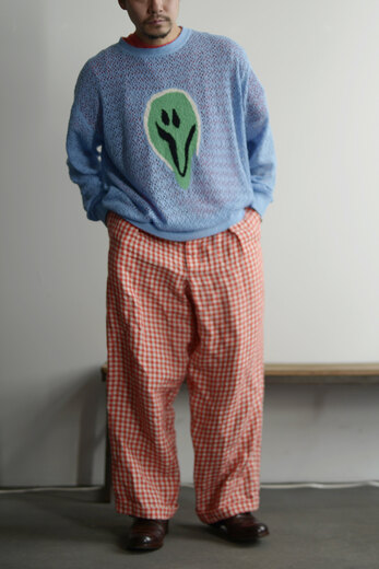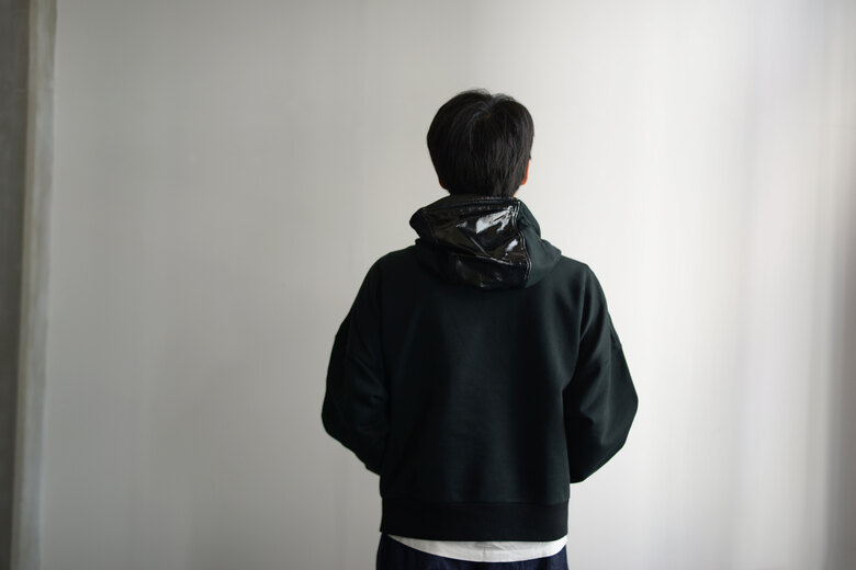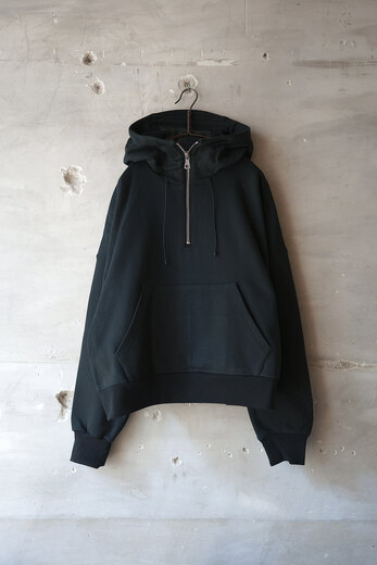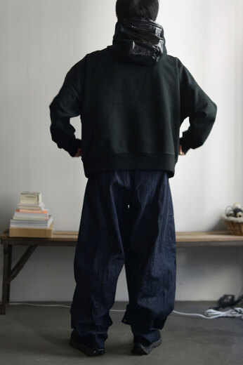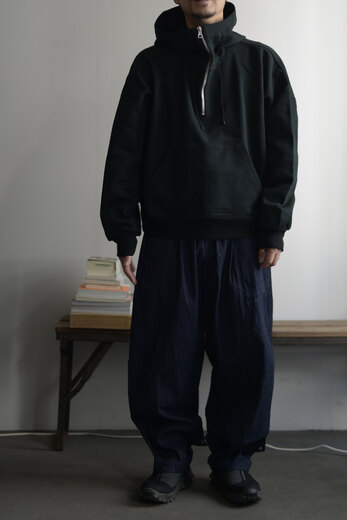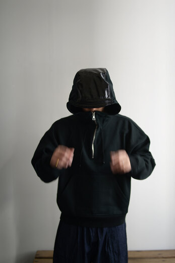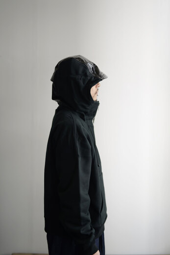 スウェットはシャツに並ぶくらい好きな洋服だ。しかしフードとなると話は異なる。普段あまり着ないし、肩が凝るからだ。稀におっー!と思うものに出会う。今回はdaisuke tanabeのalienがそうだった。設計(パターン)の妙なのか、均一に重量が分散されているような。軽くて、フードが全く気にならない。フードに配されたパテントレザーがある事でアクセントにもなり、フードがしっかり立つ。被った時にも形の良さがわかる。ZIPはレザージャケットと同じriri。春は一枚で主役になれる洋服だと思う。