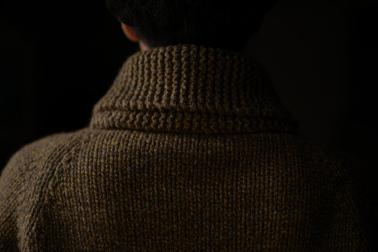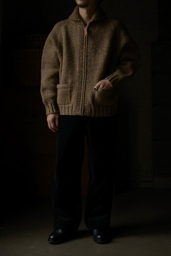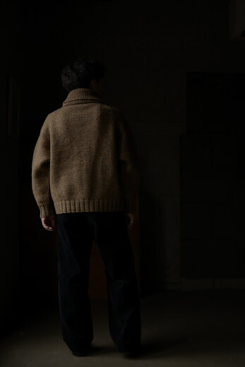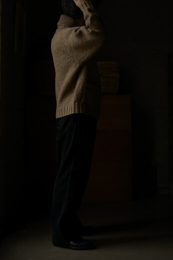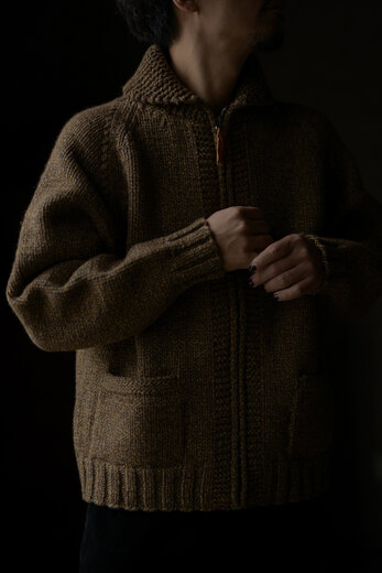 カウチンが着たい、カウチンが着たい、カウチンが着たい、と願ってい時に出会ったSlopeslow。今年も素晴らしいカウチンが届きました。新色のマロンはブラウンのヤクに沢山の色のラムウールを掛け合わせて作られた糸だそうで、まるでツイードのような雰囲気を感じました。とても複雑で美しく、ずっと見ていられる、そんな糸。カシミアかと勘違いしてしまう肌触りで全くチクチクしない。限界まで目を詰めて編んでいる為、型崩れもなくアウターとしての保温性も非常に高い手編みのニット。一つ一つ人の手が加わった温かみを感じるカウチンセーターです。